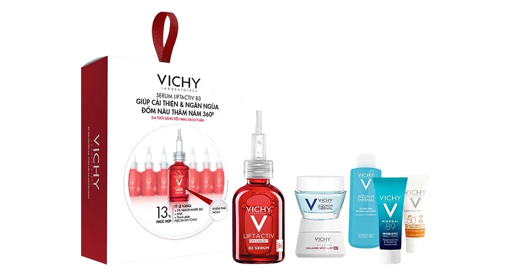 Công dụng chính: bộ sản phẩm Vichy giúp chăm sóc da toàn diện, cải thiện ngừa đốm nâu thâm nám. Đồng thời, tinh chất giúp làm đều màu da, giúp da tươi sáng, rạng rỡ sau 8 tuần sử dụng.