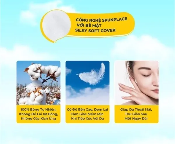 - Công nghệ Spunlace xử lý màng bông bằng tia nước áp lực cao giúp bông mịn, dai, không xơ bông trên bề mặt