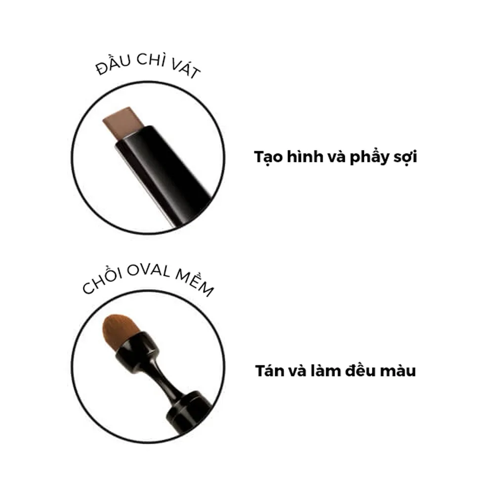 Chì kẻ mày được thiết kế 2 đầu, một đầu chì dẹp mảnh giúp hiệu chỉnh khuôn chân mày, tạo dáng định hình cho chân mày sắc nét, làm đầy phần mày bị thưa thớt mang lại đôi mày tự nhiên và phù hợp với mọi gương mặt. Một đầu cọ dạng chổi hình bầu dục giúp tán đều phần thiếu ở đuôi mày.