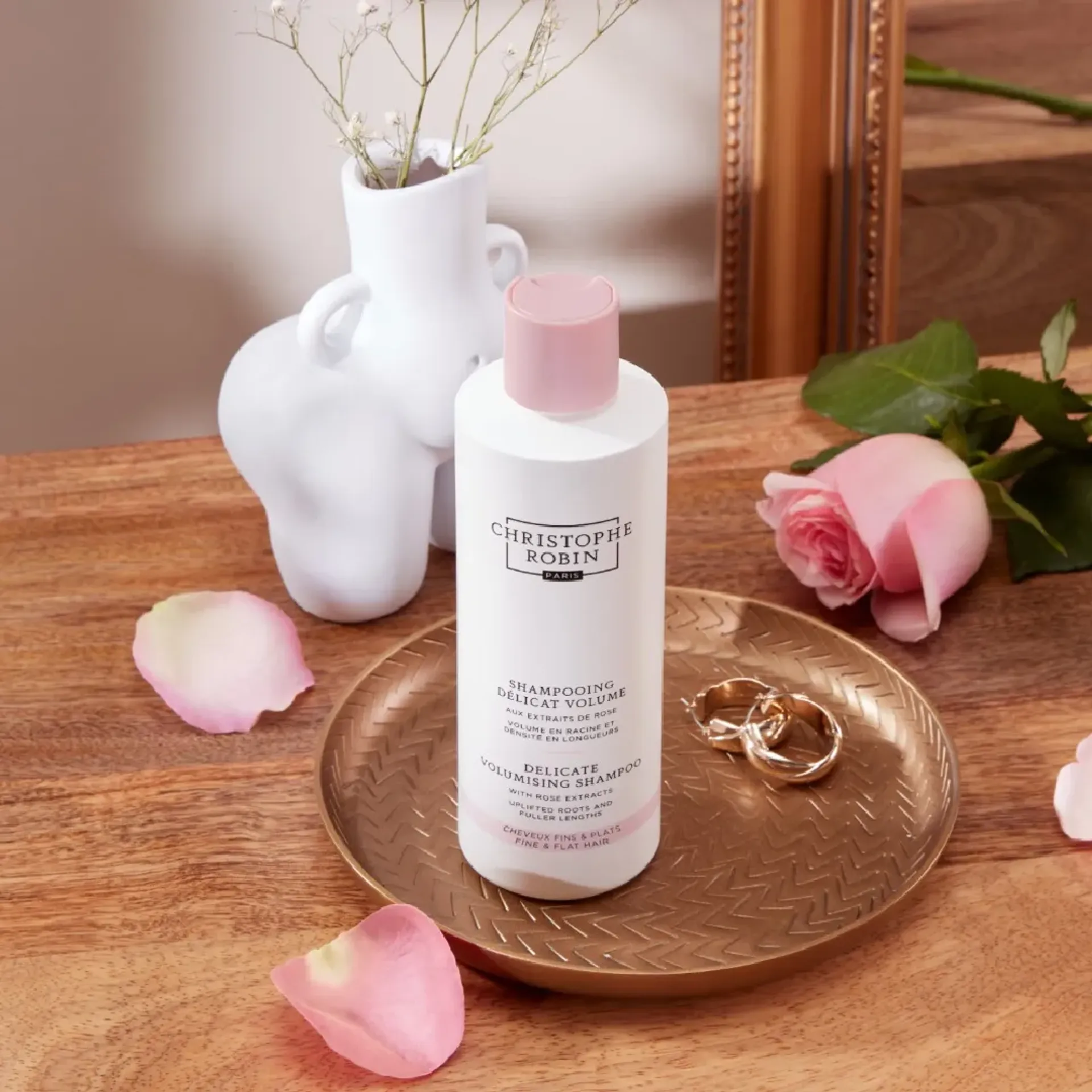CHRISTOPHE ROBIN Delicate Volumising Shampoo with Rose Extracts là dầu gội cao cấp dành cho tóc mảnh và thiếu sức sống, giúp làm sạch dịu nhẹ và tăng độ phồng tự nhiên. Với chiết xuất hoa hồng quý phái cùng công thức giàu dưỡng chất, sản phẩm mang lại mái tóc bồng bềnh, mềm mại và tỏa hương thanh khiết.