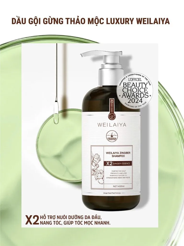 Weilaiya Luxury Ginger Shampoo là dòng dầu gội chăm sóc tóc cao cấp với chiết xuất gừng tươi Vân Nam, rễ gừng, vỏ lựu và protein hạnh nhân ngọt thủy phân. Công thức thanh lọc nhẹ nhàng giúp loại bỏ dầu thừa, bụi bẩn và gàu trên da đầu, đồng thời nuôi dưỡng nang tóc khỏe mạnh, hỗ trợ giảm rụng tóc và làm chậm quá trình lão hóa da đầu.