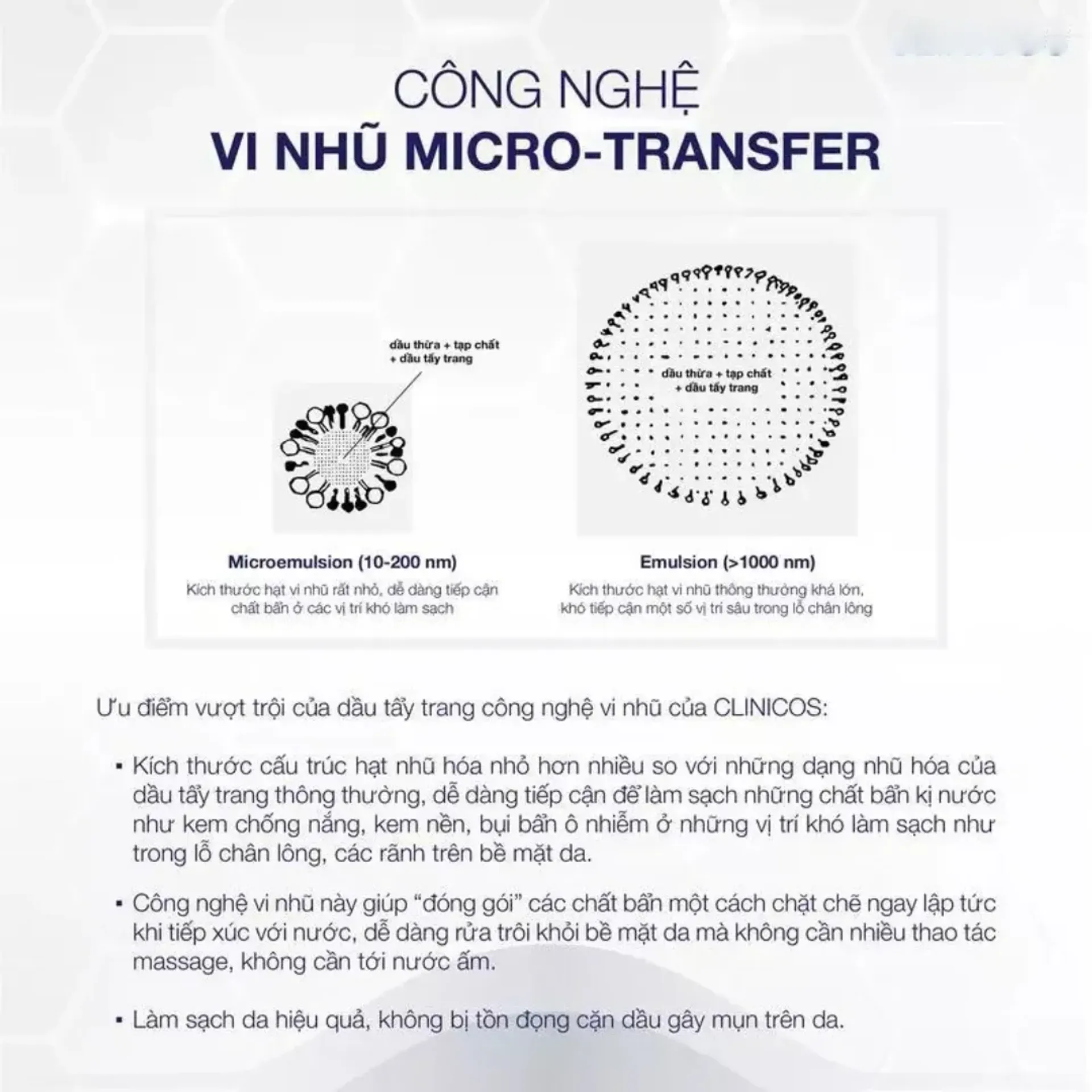 Công dụng: dầu tẩy trang vi nhũ Clinicos Micro Transfer Cleansing Oil là sản phẩm tẩy trang làm sạch lớp trang điểm, bụi bẩn, dầu thừa tối ưu cho làn da. Đồng thời, sản phẩm giàu ẩm và ngừa oxi hóa hiệu quả cho làn da sạch thoáng, dễ chịu sau khi sử dụng.