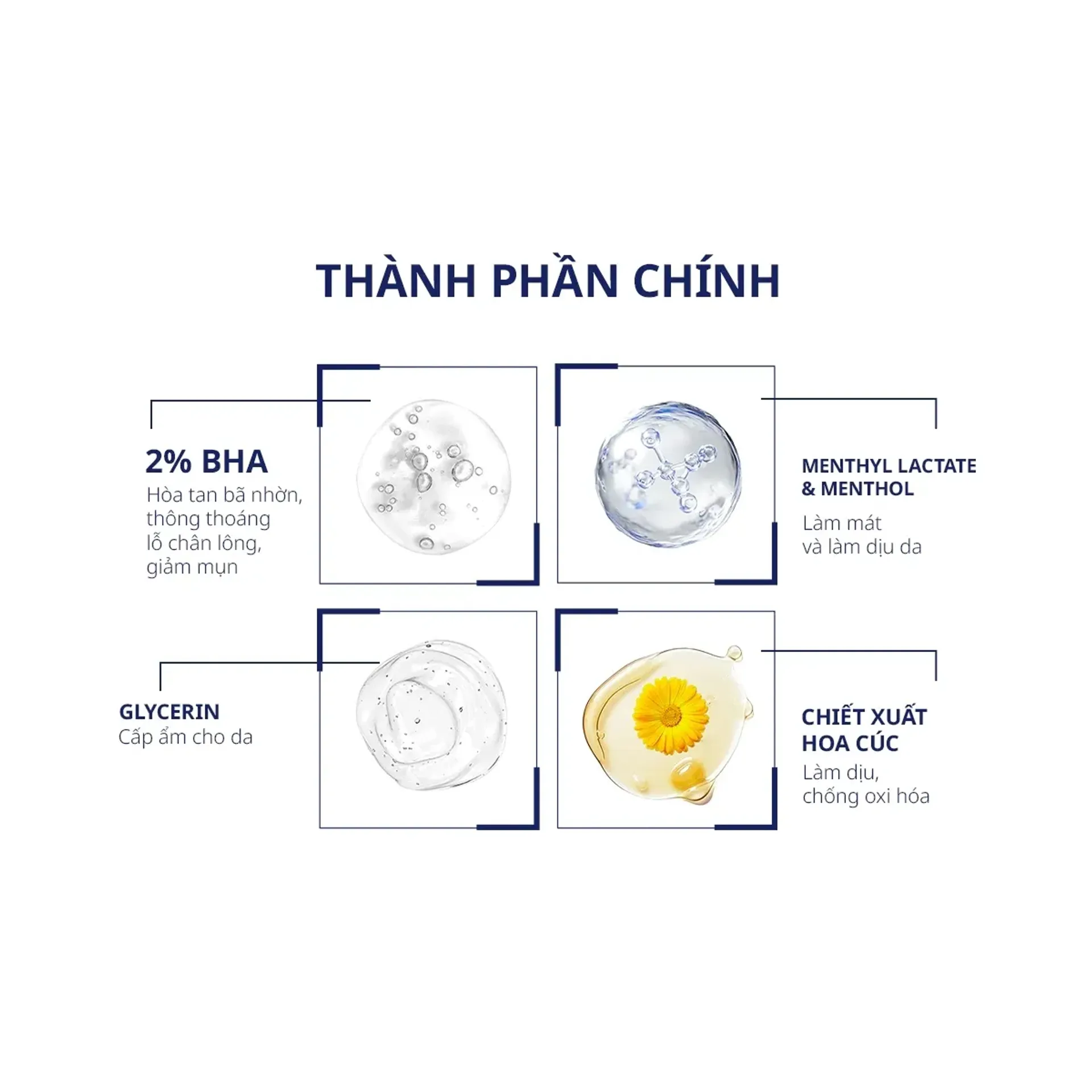 2% Salicylic acid (BHA): hoạt chất có khả năng làm sạch tế bào chết bên trong lỗ chân lông, thanh lọc và làm mịn lỗ chân lông, làm đều màu da và cải thiện kết cấu da mịn màng.