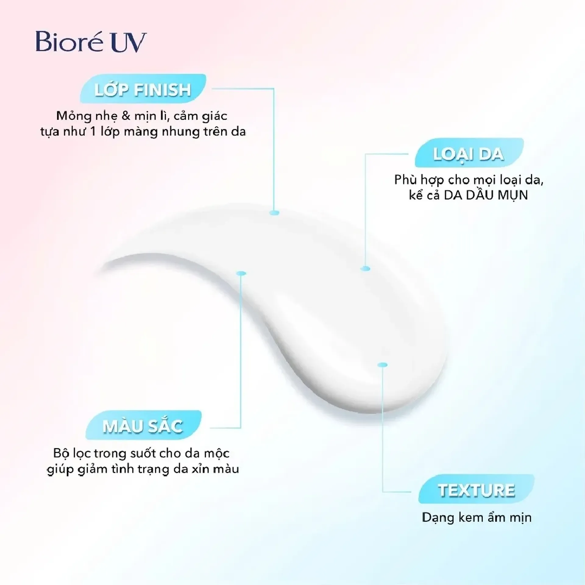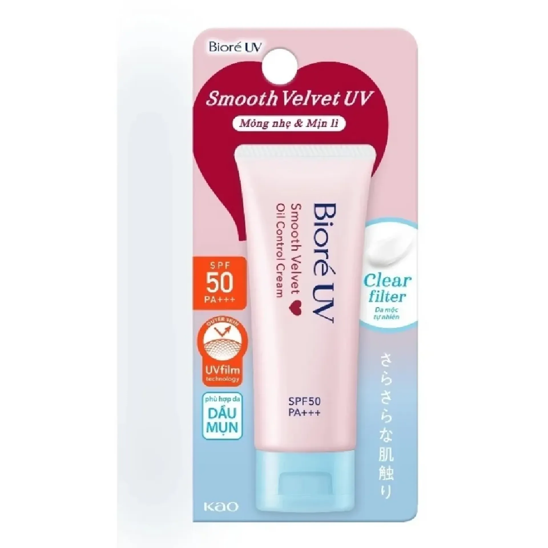 Công dụng: Biore UV Smooth Velvet Oil Control Milk SPF50+ PA++++ là kem chống nắng kiểm soát dầu vượt trội kết hợp giữa công nghệ chống nắng tiên tiến cùng khả năng làm mịn da hoàn hảo. Đồng thời, hỗ trợ kiểm soát bã nhờn, dầu thừa hiệu quả suốt cả ngày.