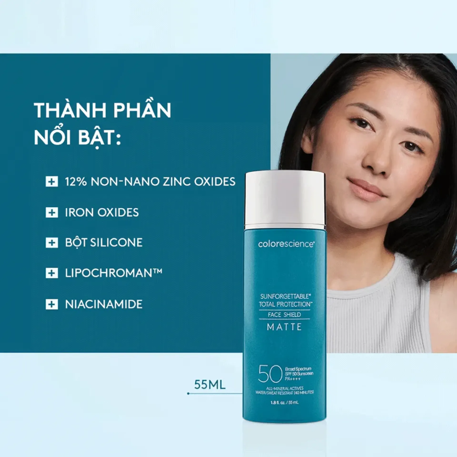 Colorescience Sunforgettable® Total Protection™ Face Shield Matte SPF 50 là kem chống nắng khoáng chất chuyên biệt cho da dầu hoặc da hỗn hợp, với kết cấu mỏng nhẹ và hiệu ứng lì không nhờn bóng. Công nghệ EnviroScreen® giúp bảo vệ da không chỉ trước tia UVA/UVB mà còn trước ánh sáng xanh, ô nhiễm và tia hồng ngoại. Sản phẩm mang lại lớp hoàn thiện mềm mịn, kiềm dầu hiệu quả mà không làm bí da.