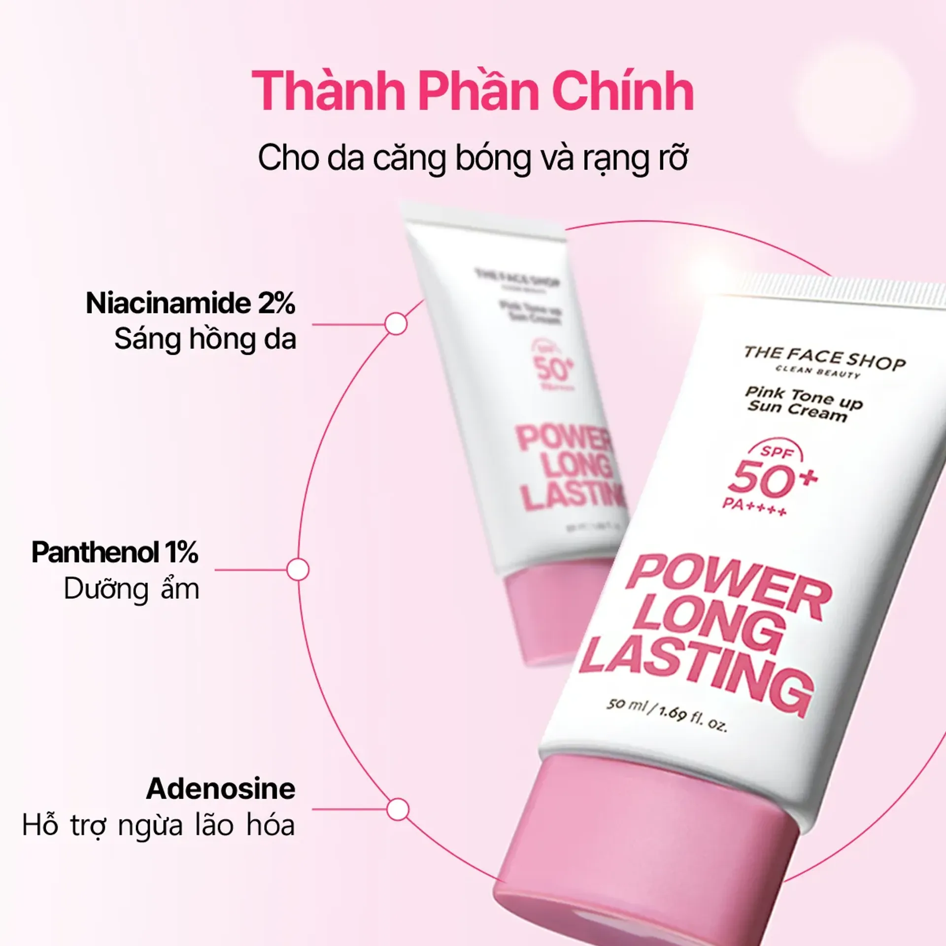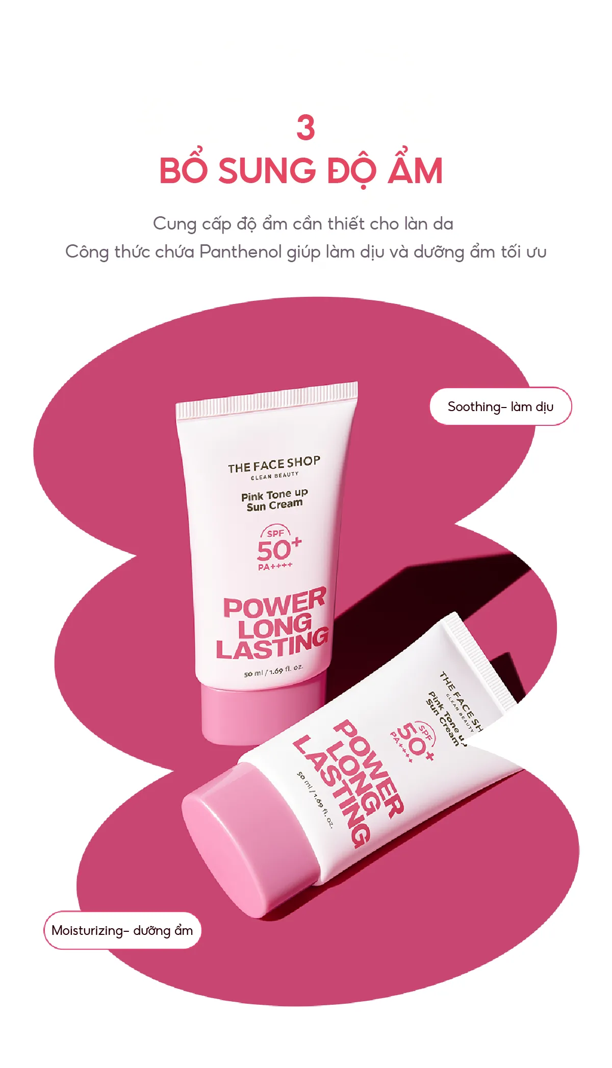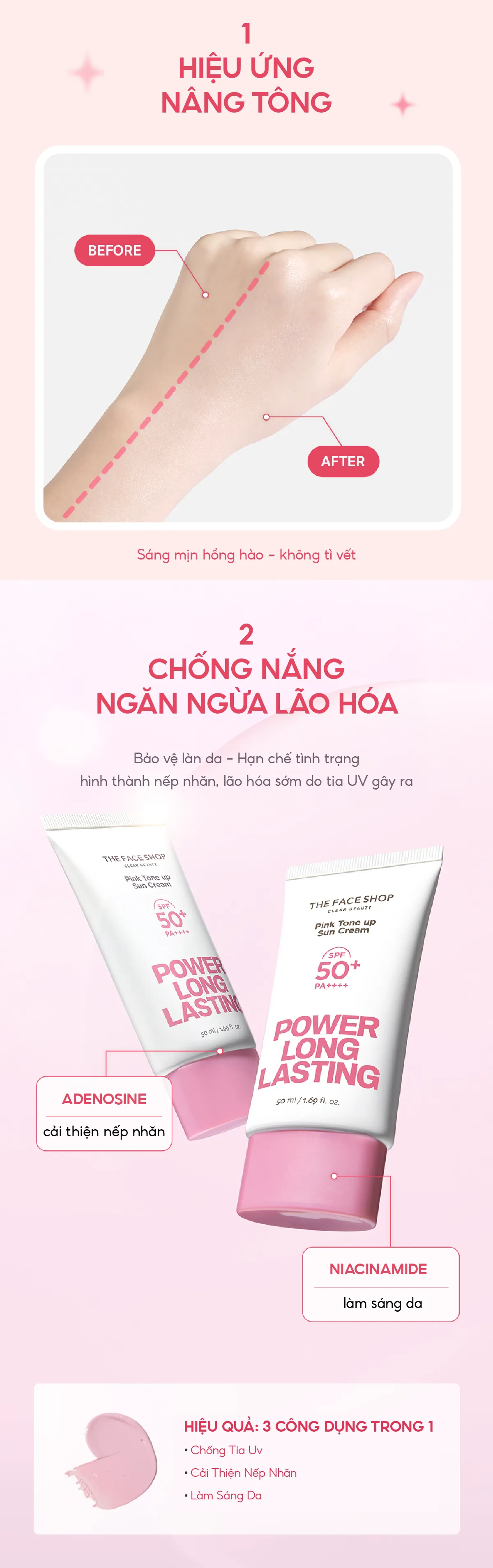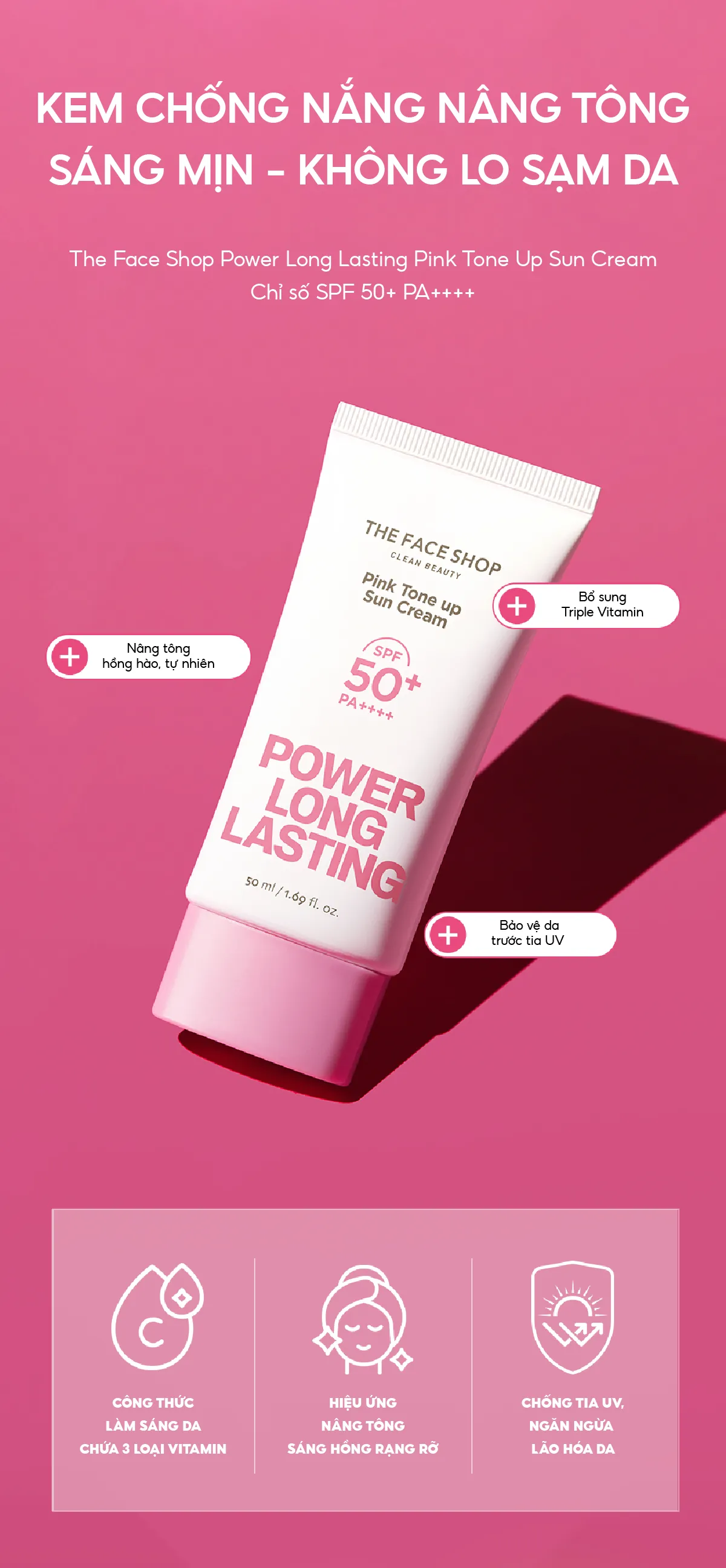 - Power Long Lasting Pink Tone Up Sun Cream hiệu chỉnh tông da đều màu & sáng hồng rạng rỡ. Đặc biệt thích hợp cho những làn da xanh xao, không đều màu.