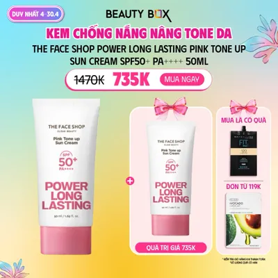 Dòng chống nắng: Kem chống nắng vật lý lai hóa họcKem chống nắng Power Long Lasting Pink Tone Up Sun Cream có màu hồng tự nhiên giúp bảo vệ làn da mạnh mẽ khỏi tác hại của ánh nắng mặt trời. Đồng thời hỗ trợ nâng tông và làm đều màu da, mang lại làn da hồng hào đầy sức sống.