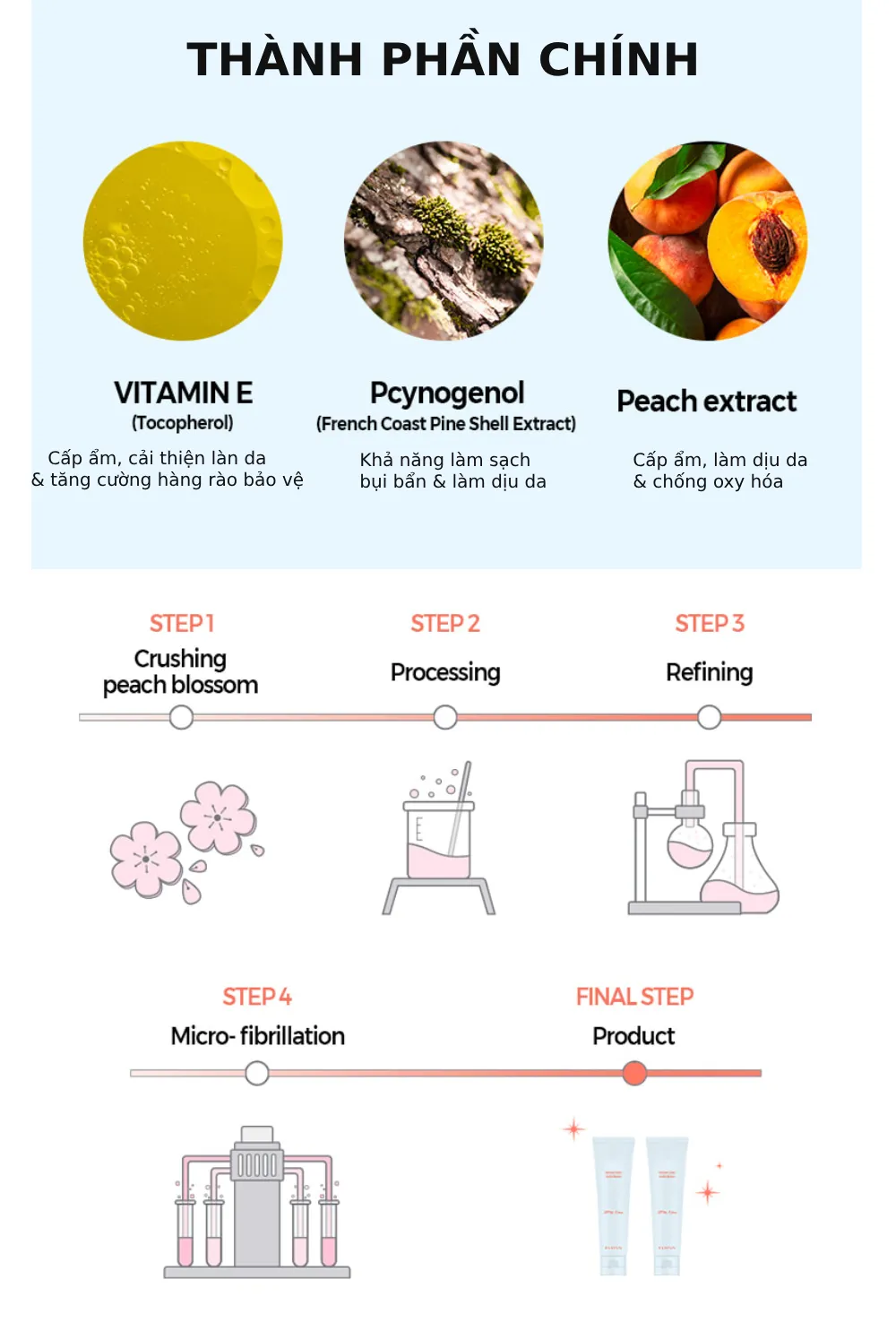 - Chiết xuất quả đào, vỏ thông đỏ (pycnogenol) và vitamin E: dưỡng ẩm, tăng cường sức sống cho da