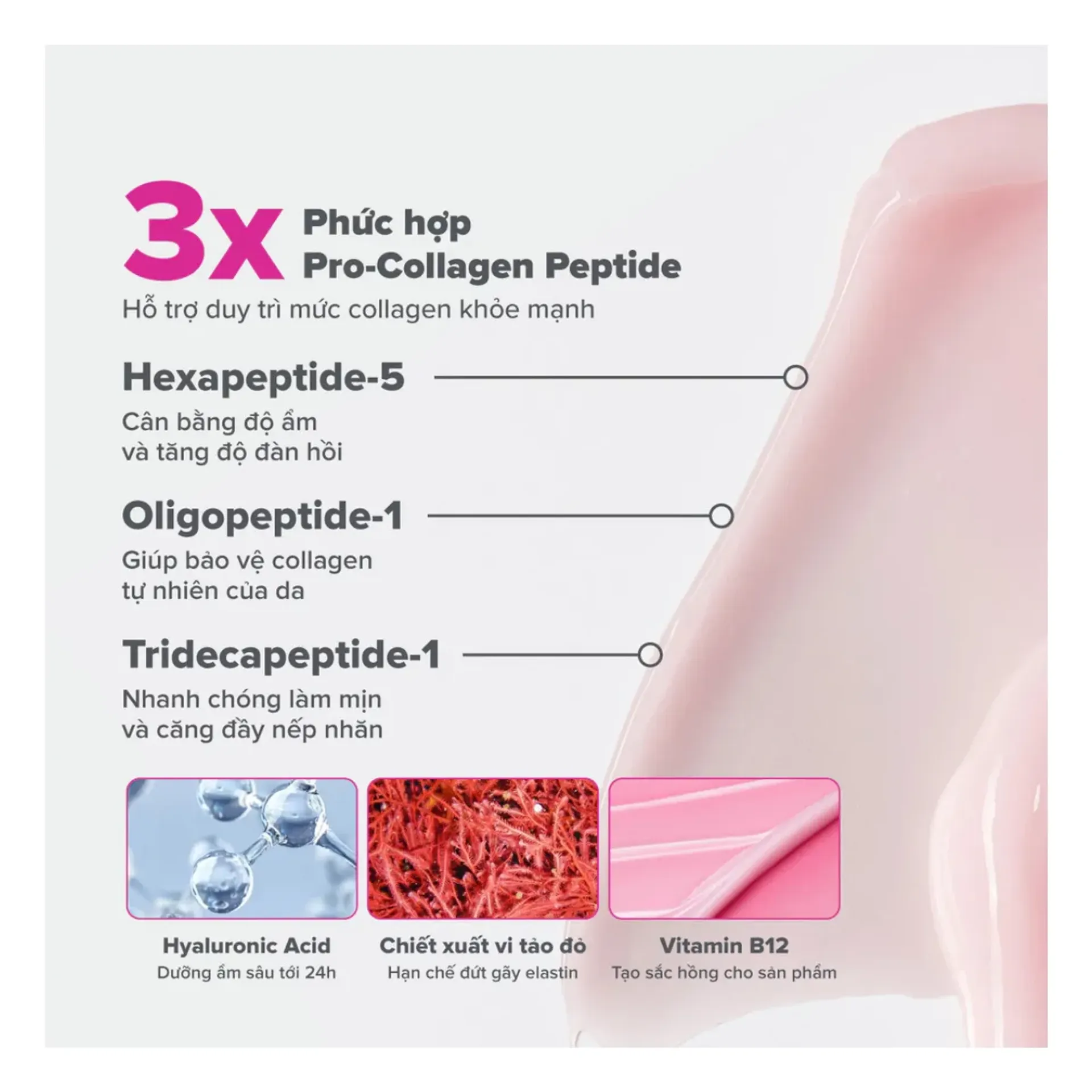 - Phức hợp 3x Pro-Collagen Peptides giúp thúc đẩy tăng sinh collagen tự nhiên, cải thiện độ săn chắc và đàn hồi của làn da.