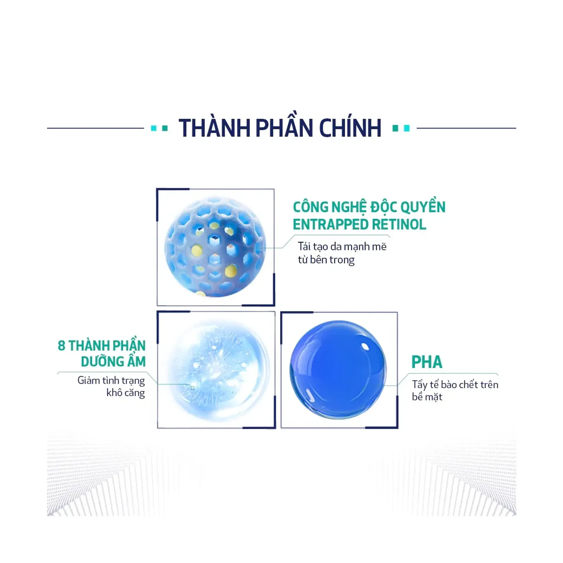 - Công nghệ vi cầu Entrapped Retinol bảo vệ khỏi ánh sáng và oxy, đồng thời phóng thích từ từ để tăng ổn định và giảm kích ứng.
