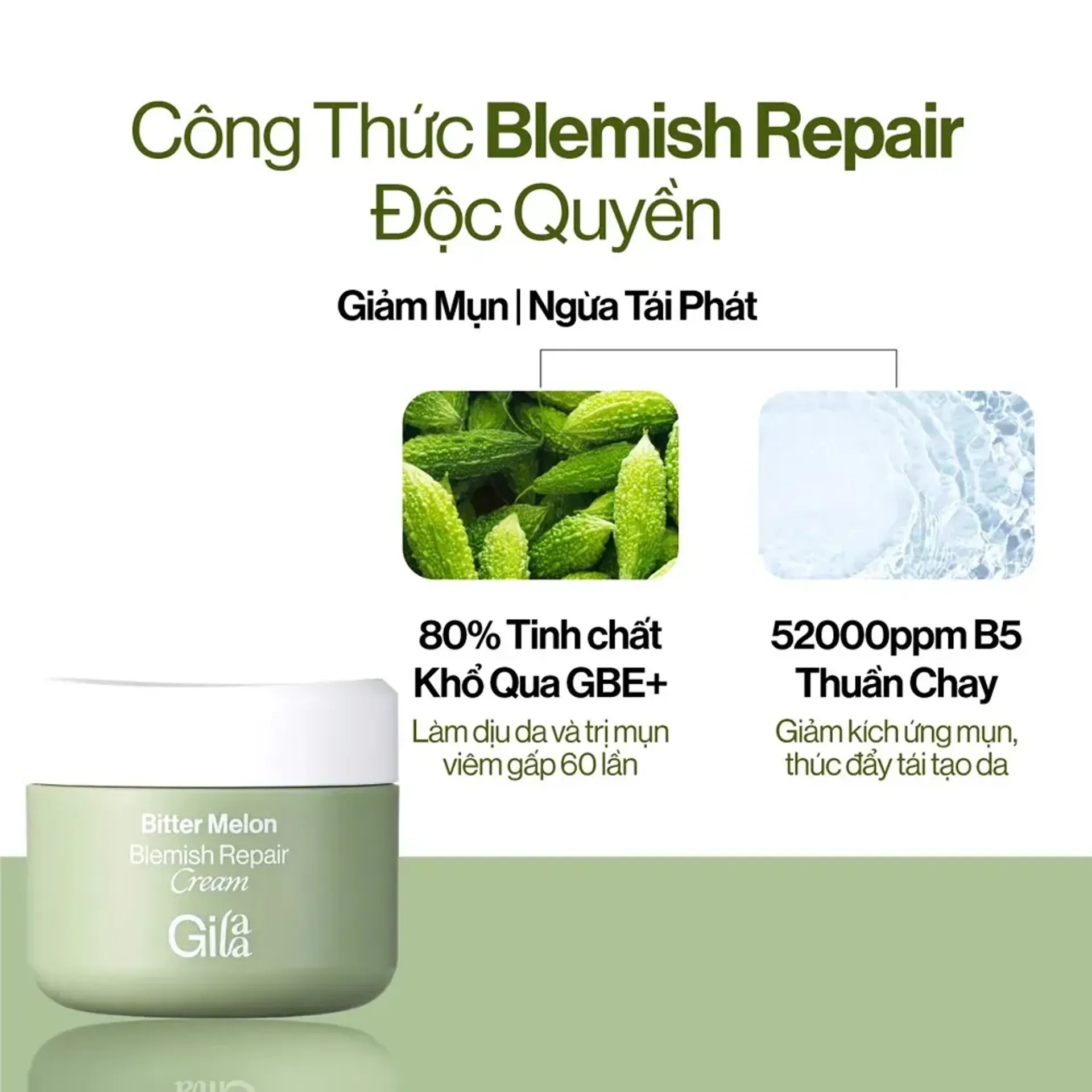 Công dụng: kem dưỡng Gilla Bitter Melon chứa tinh chất khổ qua và B5 giúp phục hồi tổn thương da mụn và khả năng khám viêm ngừa mụn tái phát hiệu quả. Đồng thời, làm dịu làm mờ thâm hiệu quả với công thức Blemish Repair độc quyền cùng thành phần lành tính, an toàn cho làn da.