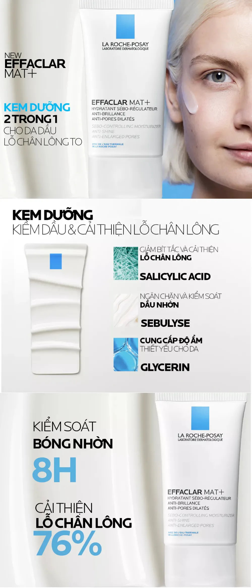 Effaclar Mat+ là dòng kem dưỡng chuyên biệt dành cho làn da dầu với lỗ chân lông to, mang đến hiệu quả kiểm soát bã nhờn vượt trội kéo dài suốt 8 giờ. Sản phẩm đồng thời hỗ trợ loại bỏ tình trạng bít tắc và cải thiện tới 76% tình trạng lỗ chân lông to, cho làn da trở nên mịn màng và thông thoáng hơn.