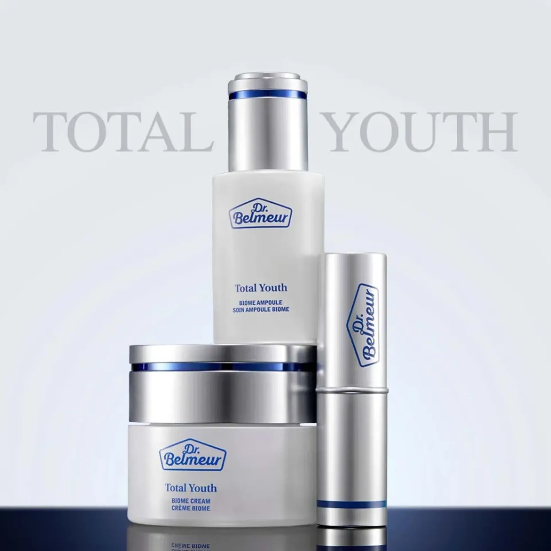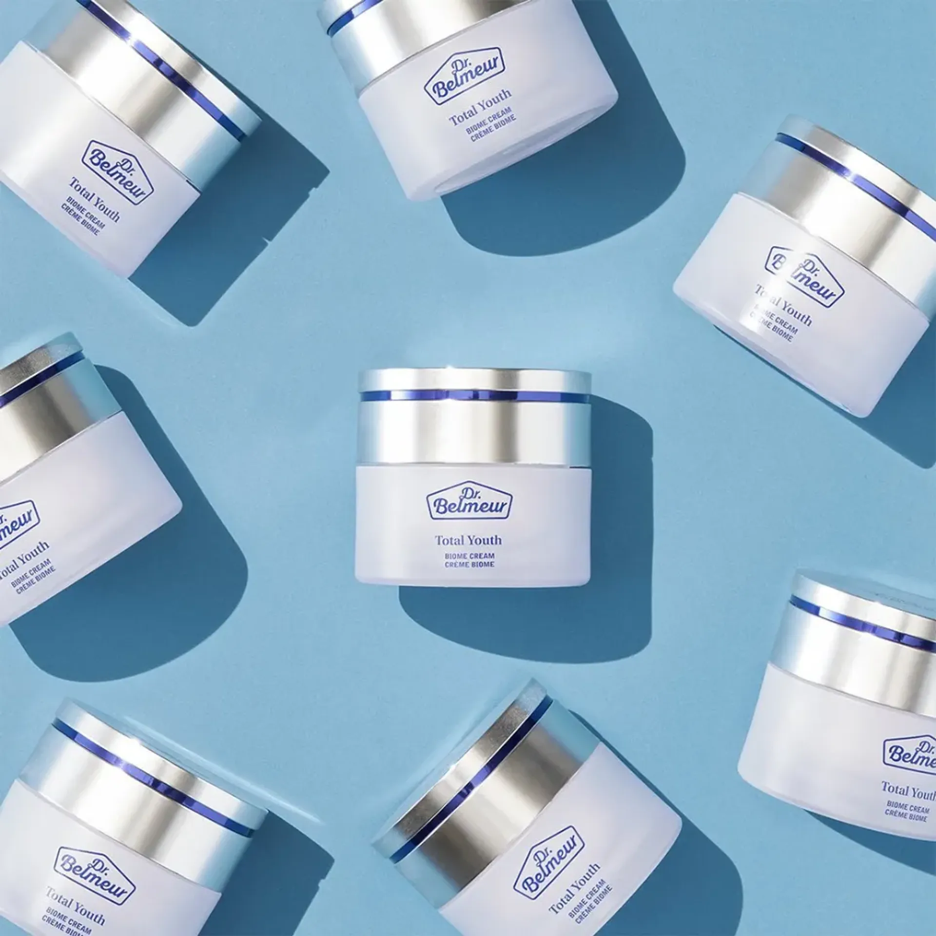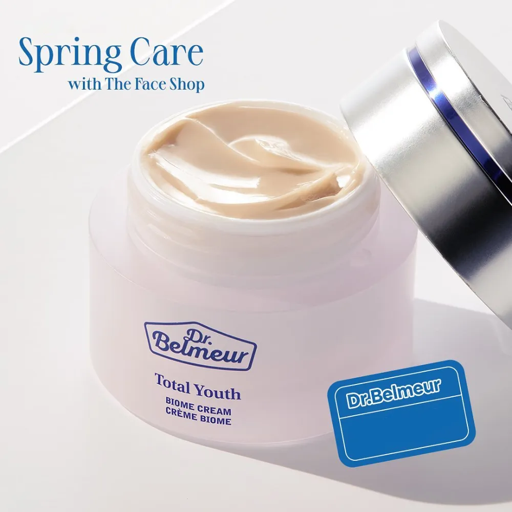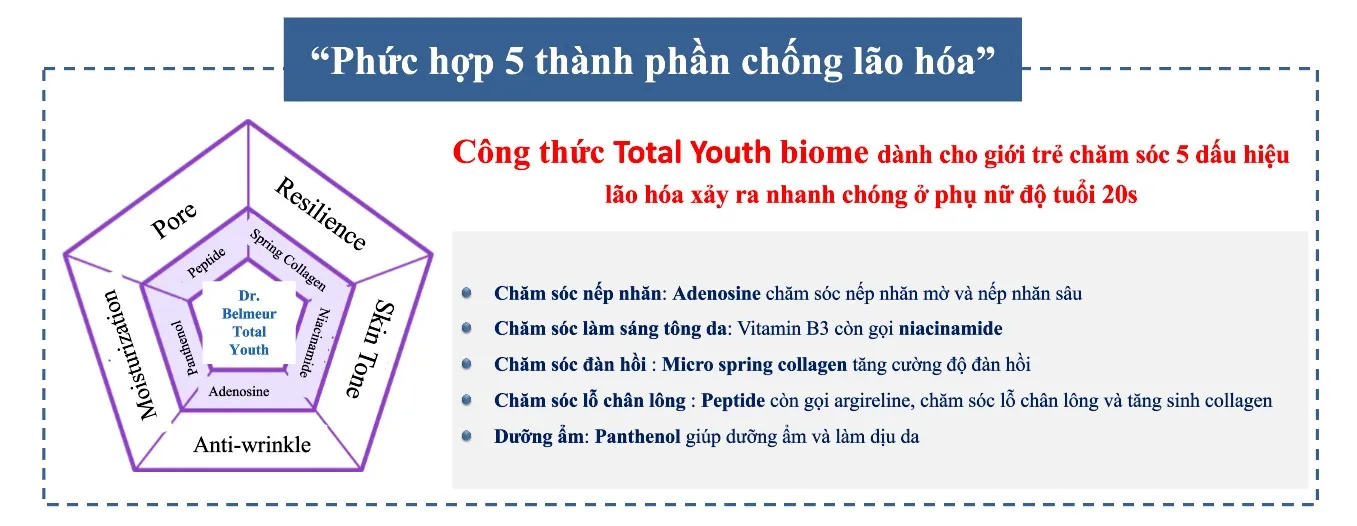 Dr.Belmeur Total Youth Biome là dòng sản phẩm chăm sóc làn da giúp cải thiện 5 dấu hiệu lão hóa gồm nếp nhăn, độ đàn hồi, độ ẩm, lỗ chân lông và da xỉn màu. Trong đó, kem dưỡng da Dr.Belmeur Total Youth Biome Cream là sản phẩm tập trung vào việc chống nhăn, tăng cường độ đàn hồi da giúp da săn chắc và đàn hồi 3 chiều từ bên trong. (*Thử nghiệm chứng minh sản phẩm có khả năng phục hồi toàn diện)