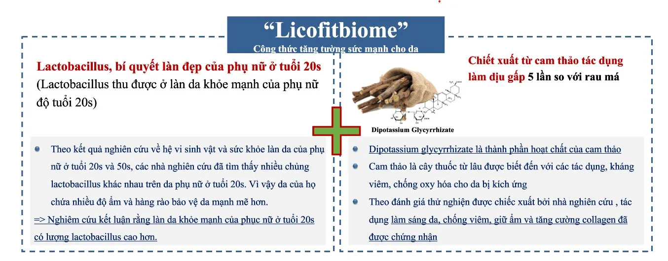 - Công thức Licofit Biome: chứa Lactobacillus (lợi khuẩn được tìm thấy trong làn da khỏe ở tuổi 20) & Cam thảo có tác dụng làm dịu da & tăng cường sinh khí làn da, ngừa các dấu hiệu lão hóa sớm.