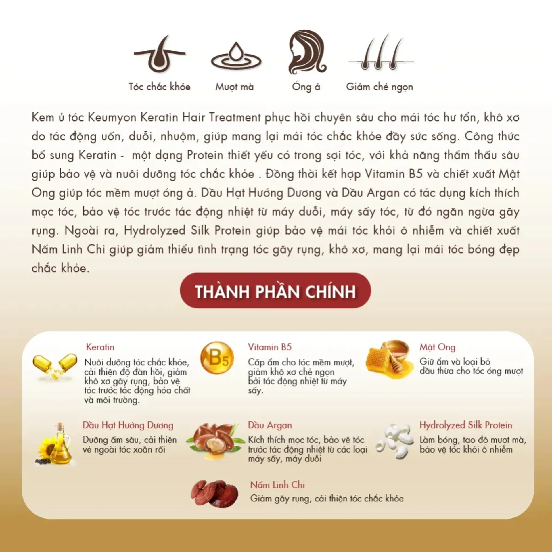Công dụng: Keumyon Keratin Hair Treatment là sản phẩm chăm sóc tóc chuyên biệt với công thức đậm đặc giàu dưỡng chất, giúp phục hồi và tái tạo tóc hư tổn hiệu quả. Sản phẩm ứng dụng công nghệ phục hồi Keratin hiện đại, thẩm thấu sâu vào từng lớp sợi tóc, mang lại mái tóc mềm mại, chắc khỏe và bóng mượt như chăm sóc tại salon.