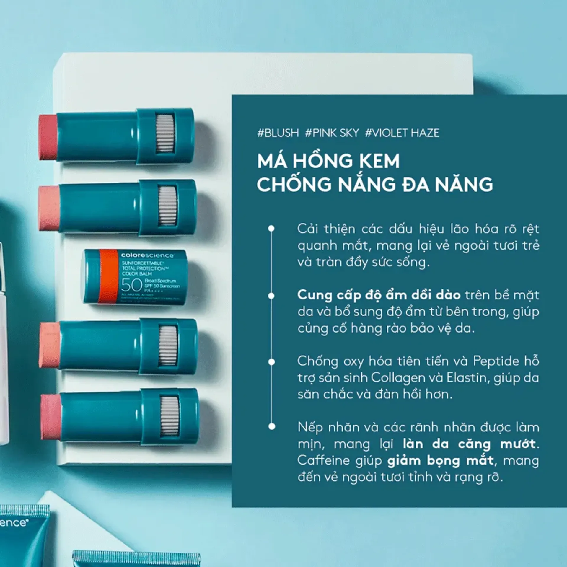 Colorescience Total Protection Color Balm SPF 50 là “má hồng kiêm chống nắng” dạng kem – sản phẩm 2 trong 1 giúp mang lại màu sắc tươi tắn cho gò má, môi, và bầu mắt đồng thời bảo vệ da khỏi tia UVA/UVB và các tác nhân môi trường. Với kết cấu nhẹ mượt, Color Balm tạo hiệu ứng căng bóng nhẹ nhàng mà không nặng mặt hay gây vệt trắng.