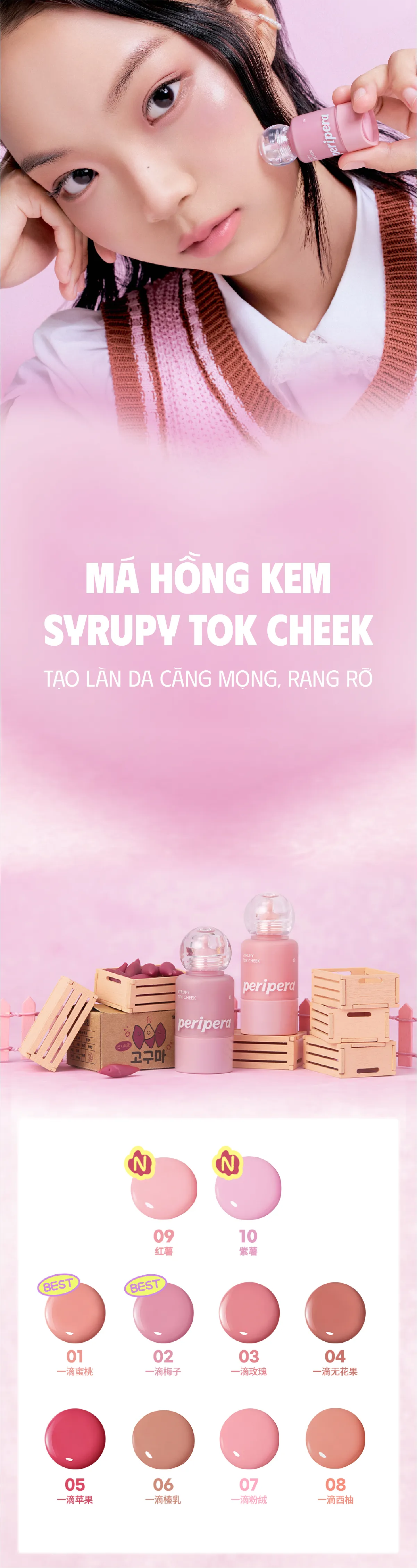 Peripera Syrupy Tok Cheek là phấn má hồng dạng kem lai gel độc đáo, mang đến lớp màu trong trẻo như si-rô tan chảy, giúp đôi má rạng rỡ và tự nhiên suốt cả ngày. Với kết cấu mỏng nhẹ, dễ tán, sản phẩm bám da tốt mà không gây nặng mặt, tạo hiệu ứng căng bóng mịn màng chuẩn phong cách trang điểm Hàn Quốc.