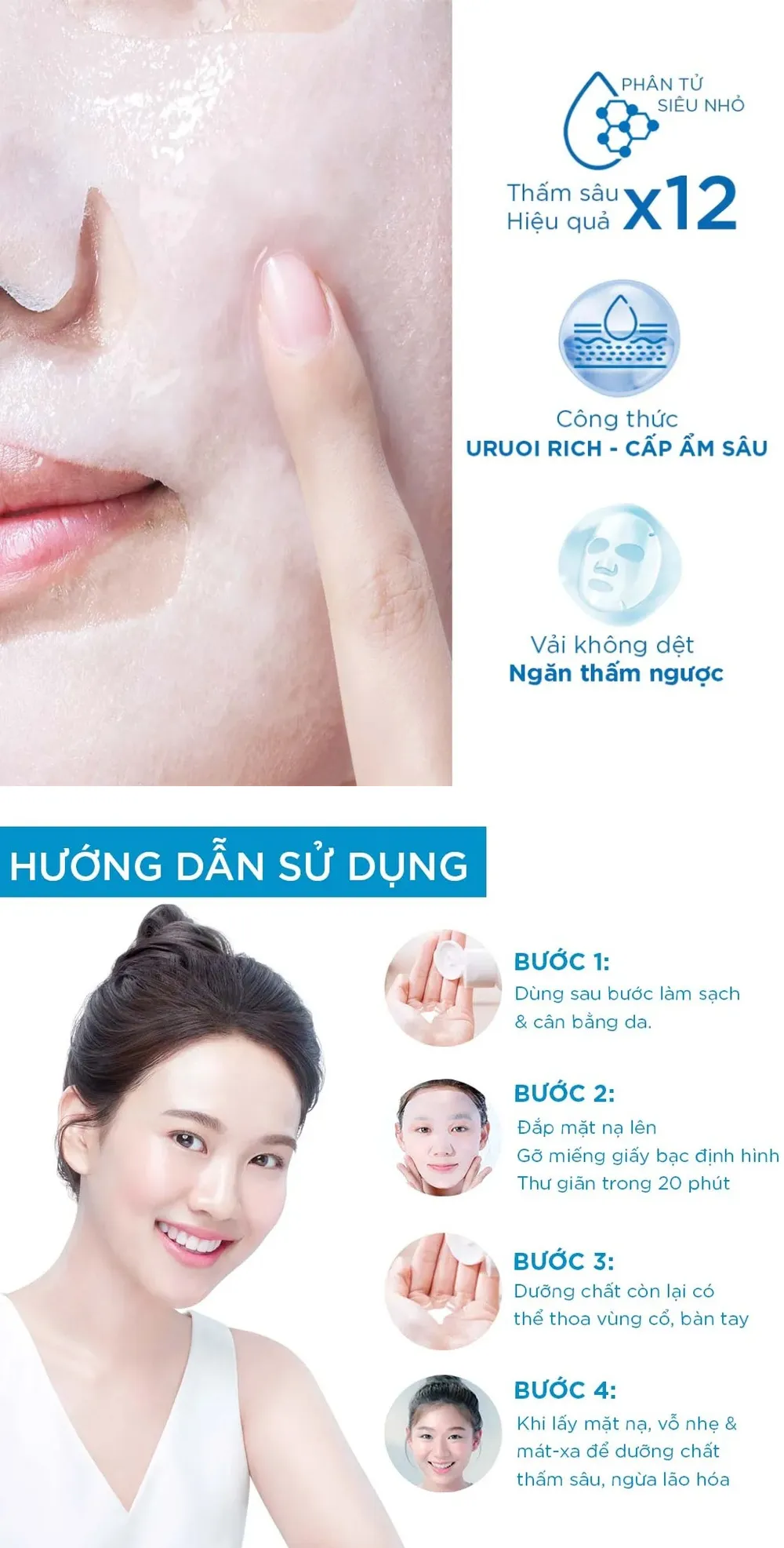 Áp dụng trên làn da sạch. Đắp mặt nạ lên mặt trong vòng 15-20 phút. Khi lấy mặt nạ ra, vỗ nhẹ và mát-xa để tinh chất dưỡng ẩm thẩm thấu sâu vào da