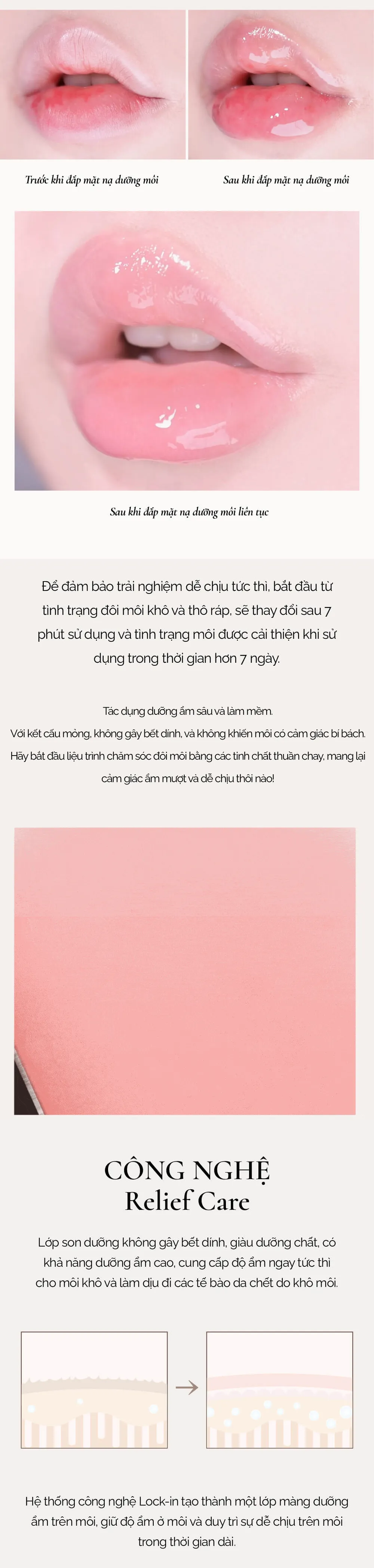 - Sản phẩm chứa dưỡng chất từ tinh dầu thực vật và 3 loại hyaluronic acid giúp cấp ẩm & khóa ẩm sâu trên môi, duy trì độ ẩm trong nhiều giờ liền