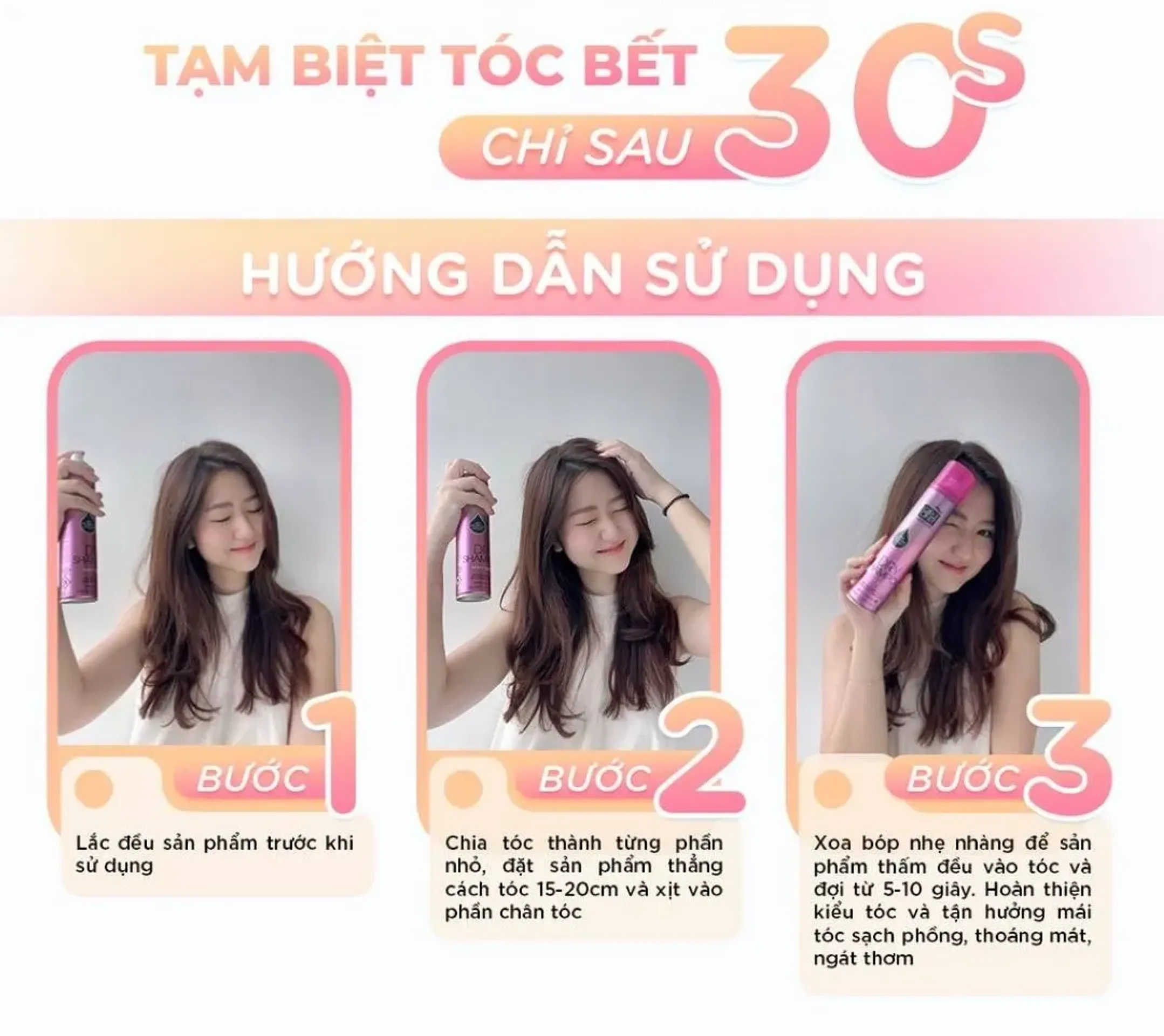 Công dụng chính: nhanh chóng làm sạch dầu thừa trên tóc, khiến tóc trở nên tơi phồng và bồng bềnh hơn mà không cần sử dụng nước.