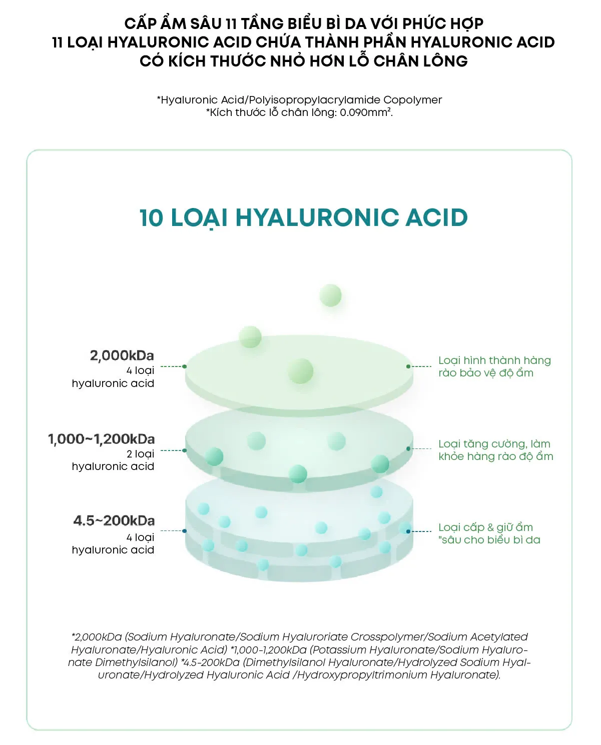 - Phức hợp 11 loại Hyaluronic acid (10 loại hyaluronic acid + hyal bubbles): cấp dưỡng dưỡng ẩm sâu, khôi phục và tăng cường hàng rào bảo vệ da. Với kích thước đa dạng, siêu nhỏ có thể thâm nhập sâu vào các lớp biểu bì da
