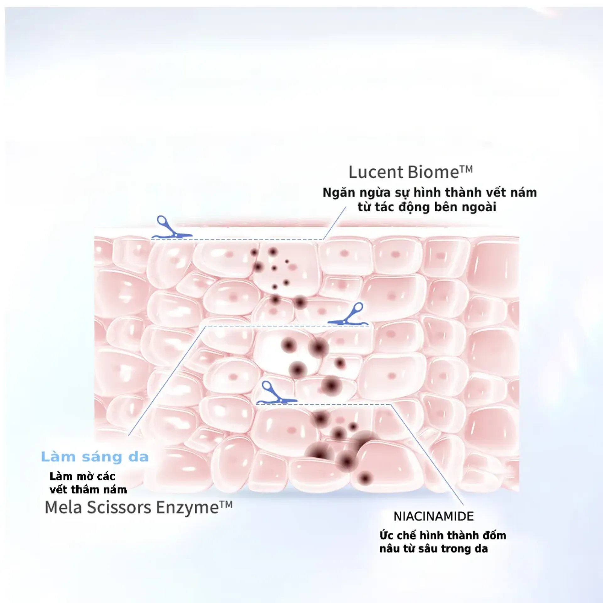 Công nghệ độc quyền Niacin Biome Complex - chứa enzyme, niacinamide & Lucent Biome giúp ức chế melanin tích tụ hình thành đốm nâu, đồng thời làm mờ và ngừa vết nám do các tác động bên ngoài: