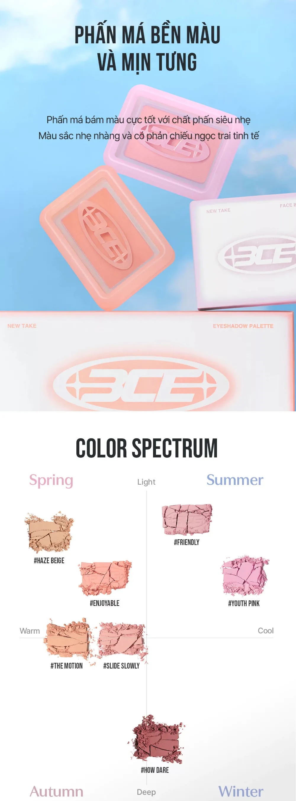 Phấn má 3CE New Take Blusher tôn lên vẻ rạng rỡ của gương mặt, mang đến sắc thái tươi tắn thông qua các gam màu nhẹ nhàng và tươi sáng, được phủ lên da một cách mỏng nhẹ và tinh tế. Đặc biệt, kết cấu phấn có hiệu ứng phản chiếu ánh ngọc trai dịu nhẹ, góp phần làm nổi bật đôi gò má, tạo nên vẻ đẹp thanh thoát và cuốn hút.