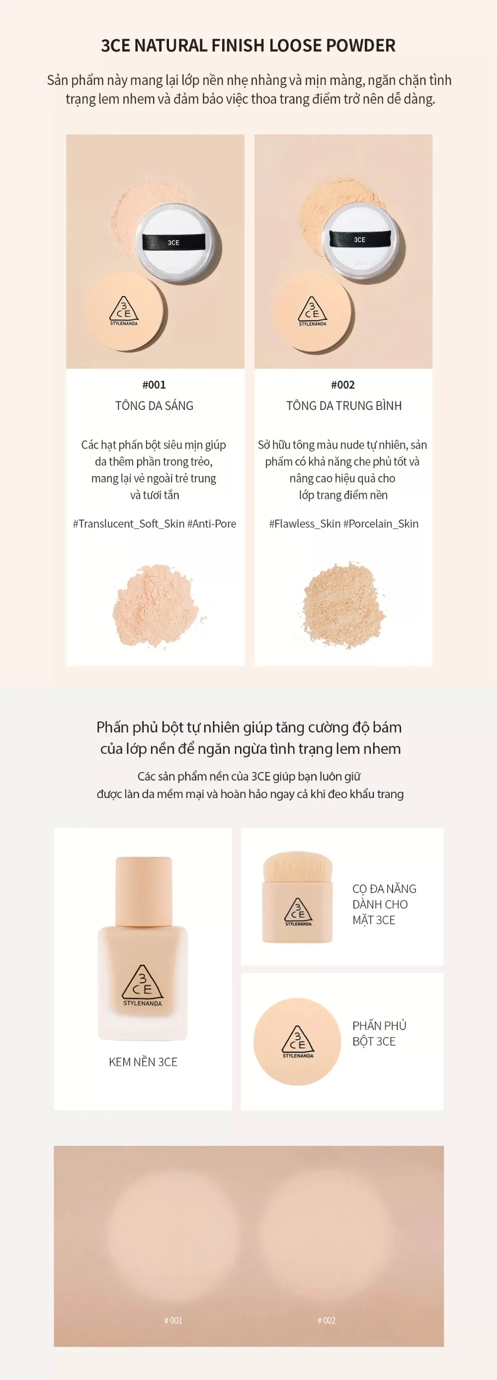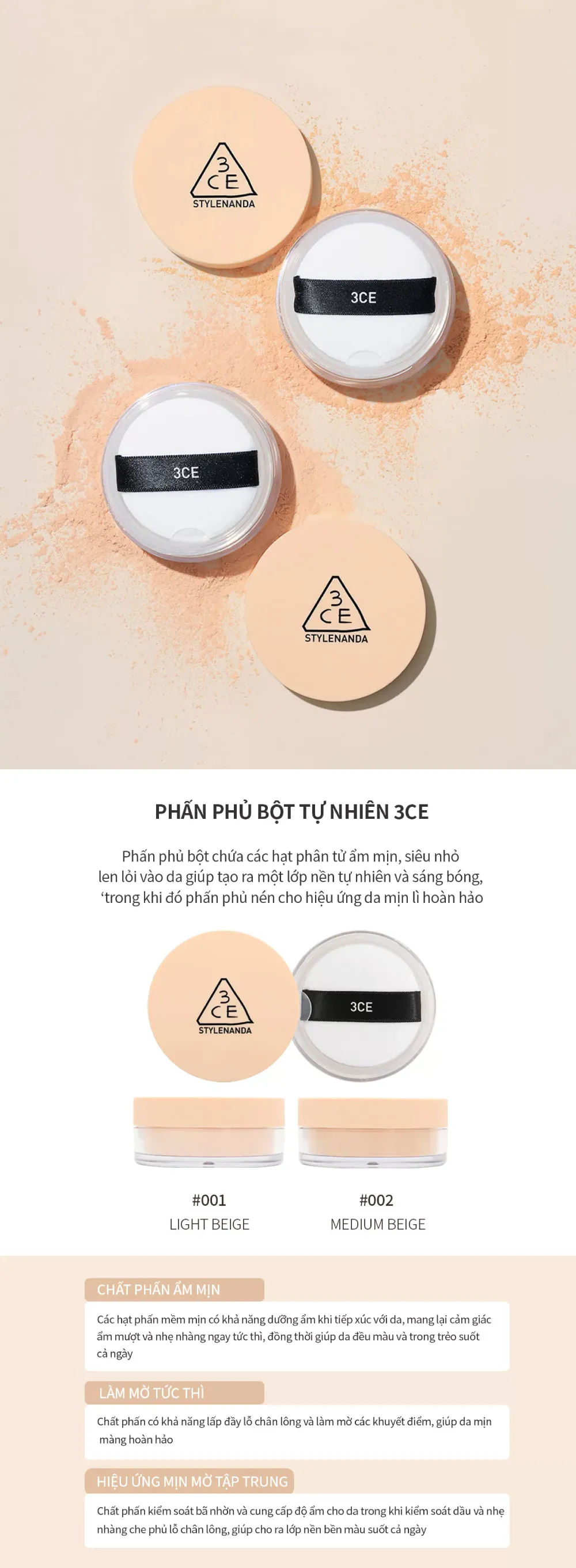 Công dụng chính: phấn phủ bột 3CE Loose Powder kiềm dầu mạnh mẽ, không làm mất độ ẩm của da đồng thời đem lại độ tự nhiên vốn có mịn màng cho làn da tươi mới.