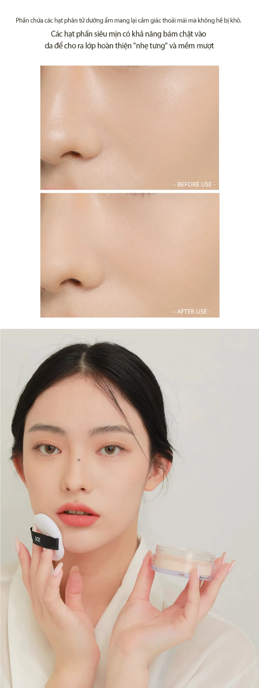 - Hiệu ứng trang điểm tự nhiên: Phấn phủ 3CE giúp tạo ra một lớp nền trong suốt, tự nhiên mà không tạo ra hiệu ứng quá dày hay cakey.