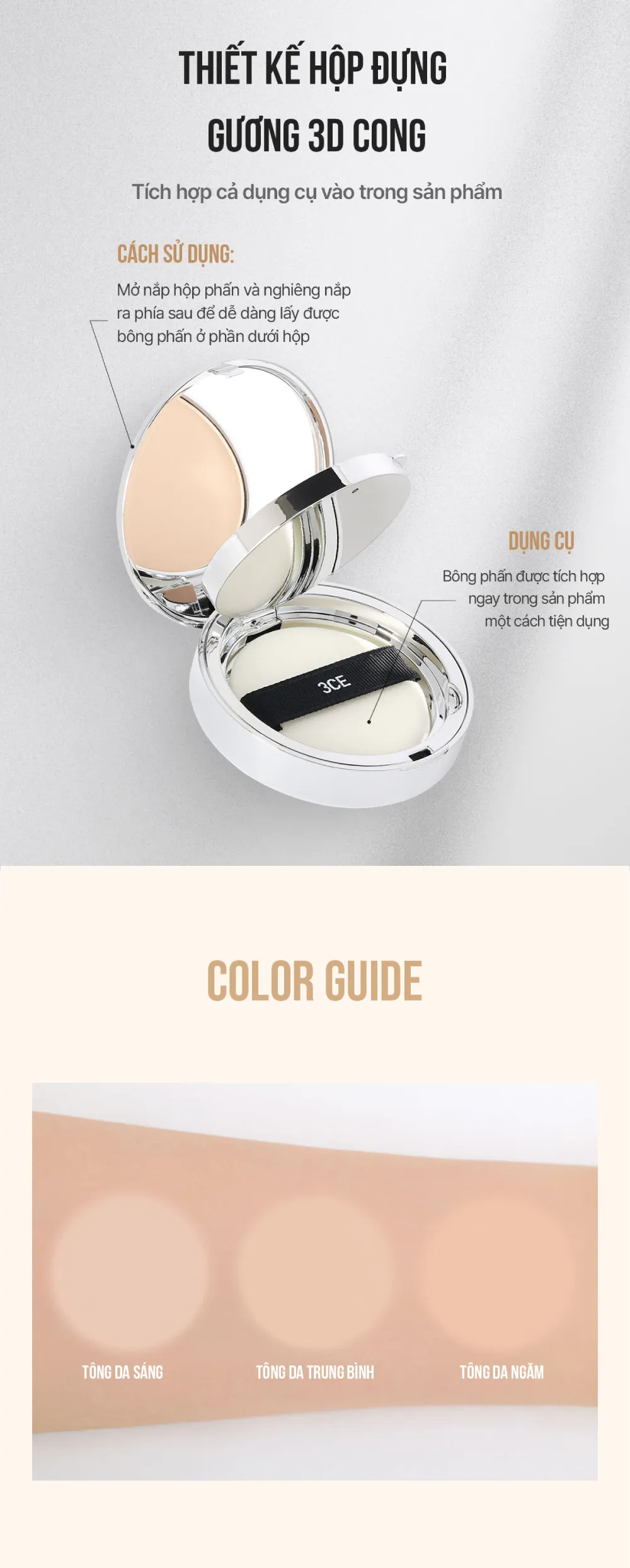 - Công dụng chính: Phấn phủ 3CE dạng nén giúp kiềm dầu, giúp cố định lớp nền lâu trôi