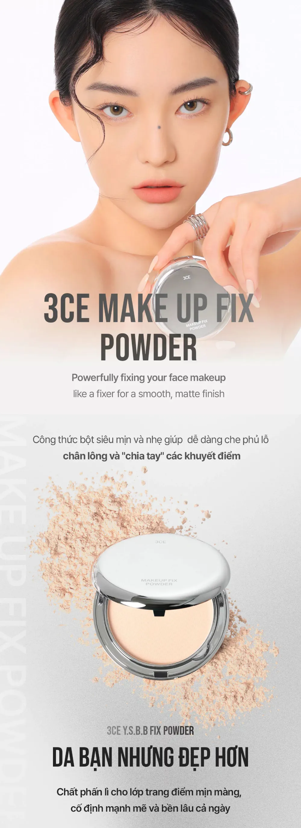 Phấn phủ 3CE Make Up Fix Powder với kết cấu phấn bột mịn với khả năng kiềm dầu cao, giúp duy trì bề mặt da khô thoáng với lớp nền lâu trôi.