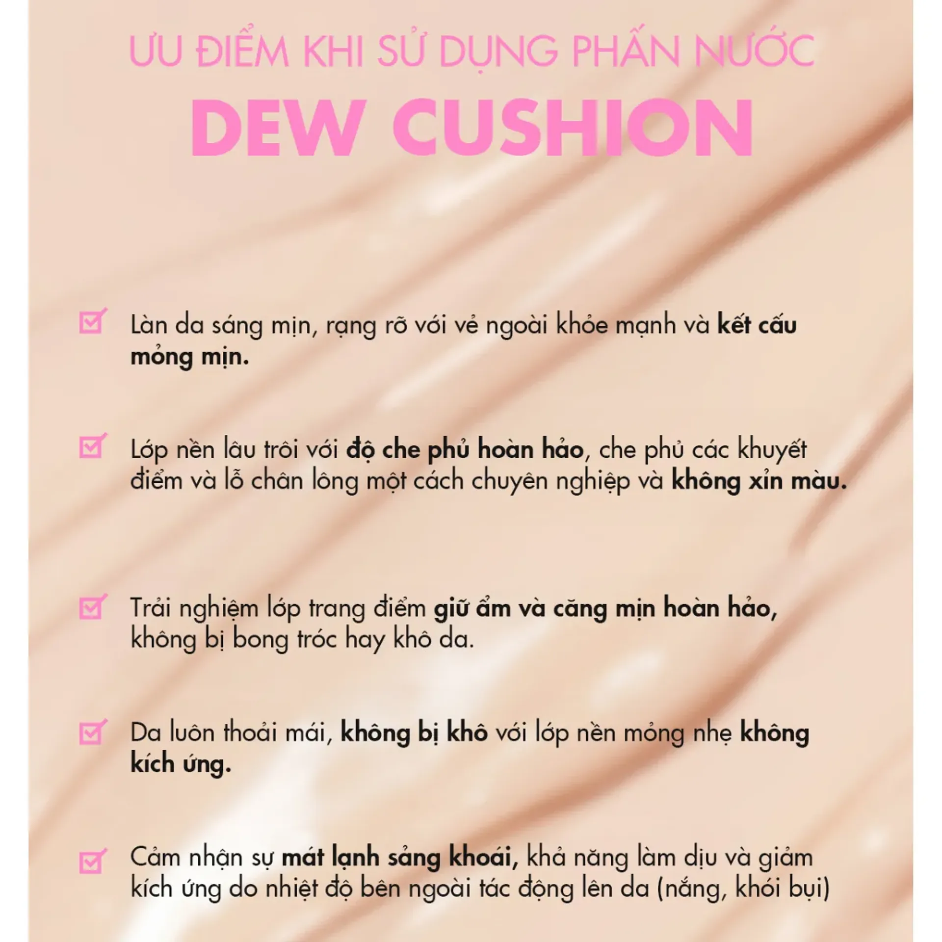 Với công nghệ “dewy” tạo hiệu ứng bóng mượt trên da, cushion sẽ tạo lớp nền khá mỏng nhẹ, ẩm mượt trên da lâu dài. Vừa không gây bí tắc lỗ chân lông vừa hạn chế lớp nền xỉn trong suốt 24h. Bên cạnh đó, Dew Power Vegan Cushion nổi bật với khả năng che phủ hoàn hảo khuyết điểm trên da và lỗ chân lông, nhờ chứa phức hợp làm mát da giúp hạn chế sự giãn nở/ bít tắc lỗ chân lông và kích ứng da do nhiệt độ môi trường bên ngoài.