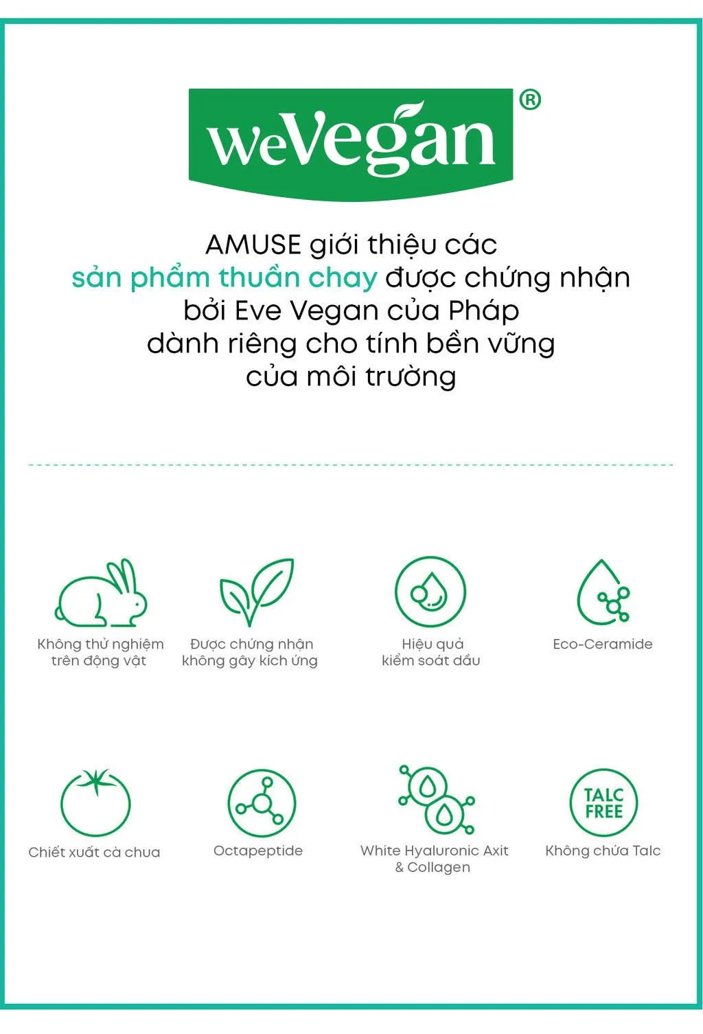 Amuse Dew Power Vegan Cushion là sản phẩm không chứa bất kỳ thành phần động vật nào, phù hợp cho người theo đuổi lối sống thuần chay (vegan) và những ai quan tâm đến bảo vệ động vật. Thương hiệu hướng đến vẻ đẹp bền vững, thân thiện với môi trường sống và mang lại vẻ đẹp tự nhiên cho làn da.