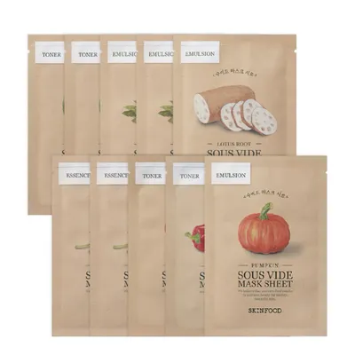 Dòng mặt nạ Skinfood Sous Vide Mask Sheet được đóng gói trong Sous Vide để khóa các chất dinh dưỡng và độ ẩm vào trong tấm. Đồng thời sản phẩm được dán nhãn V (Vegan) của Ý, thân thiện với môi trường.