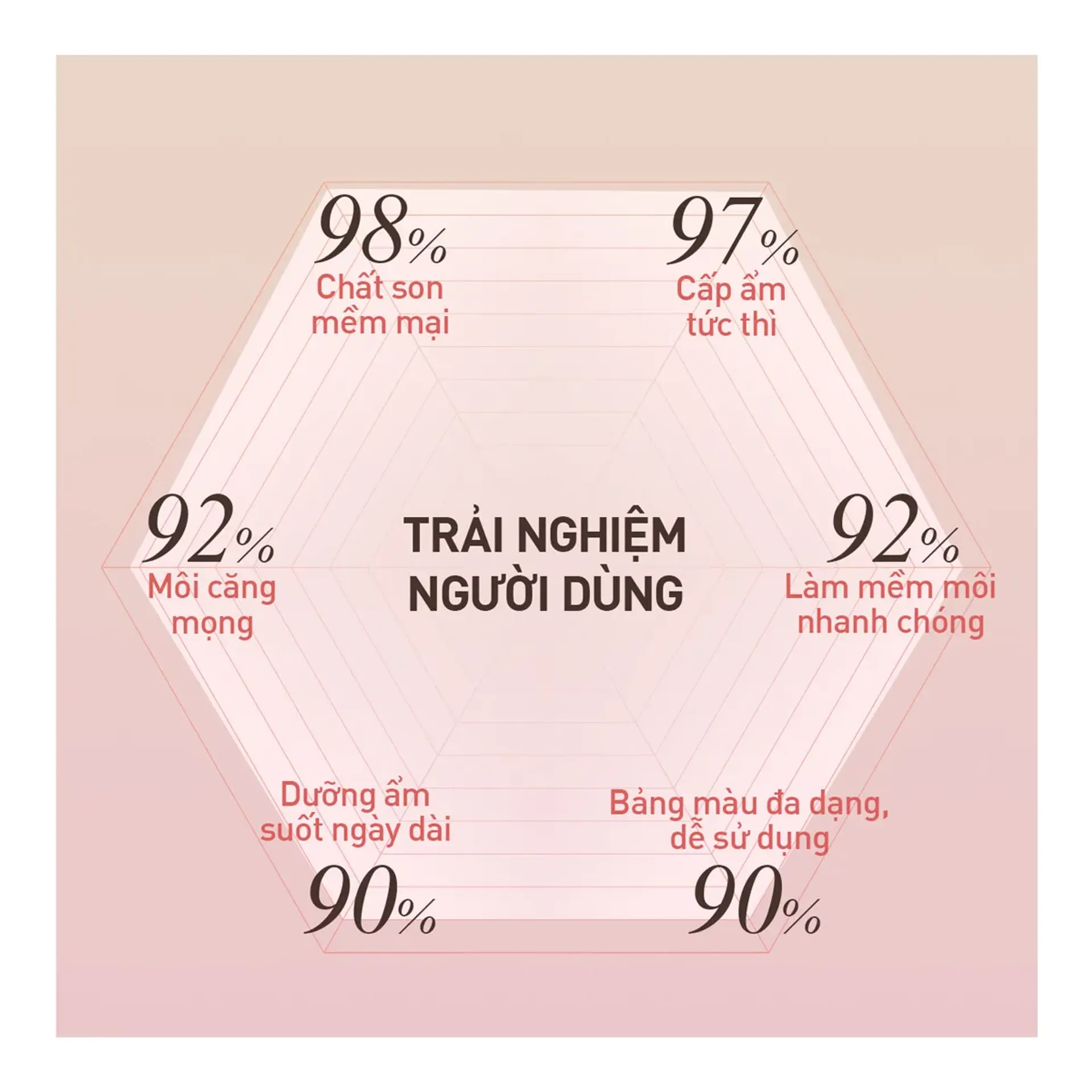 - Hiệu ứng glaze tan chảy: Lướt nhẹ trên môi như lớp mật mịn, tạo bề mặt bóng mượt tự nhiên nhưng không nhờn rít.