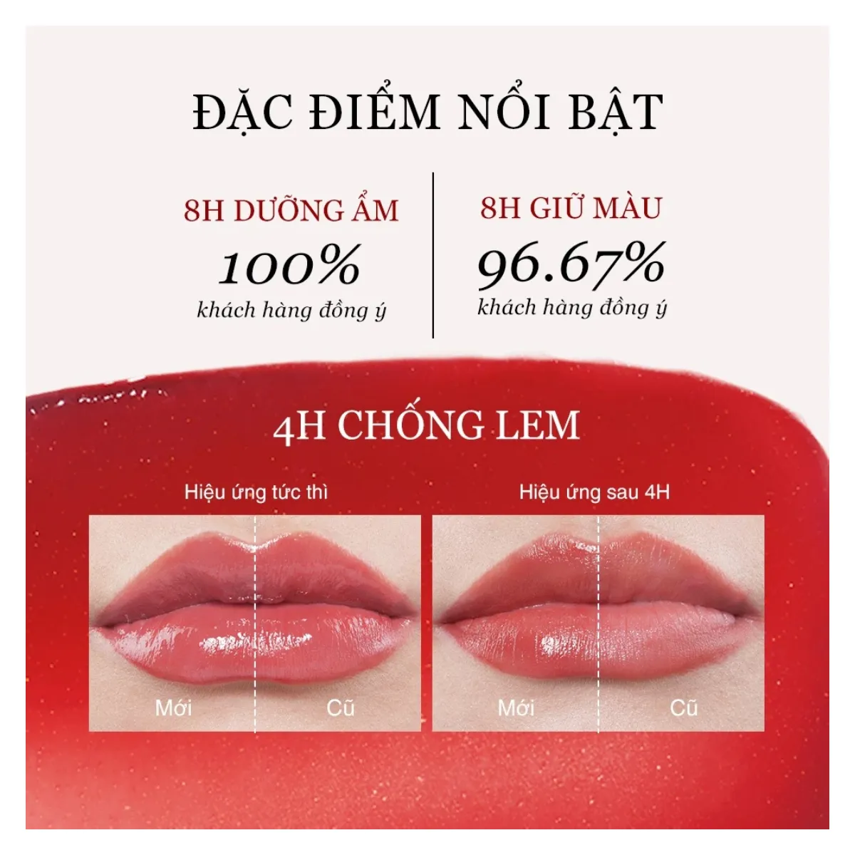 - Chất son mỏng nhẹ: Kết cấu lỏng mượt, dễ dàng sử dụng riêng lẻ hoặc kết hợp với các loại son khác để tạo hiệu ứng ombre hoặc layering.