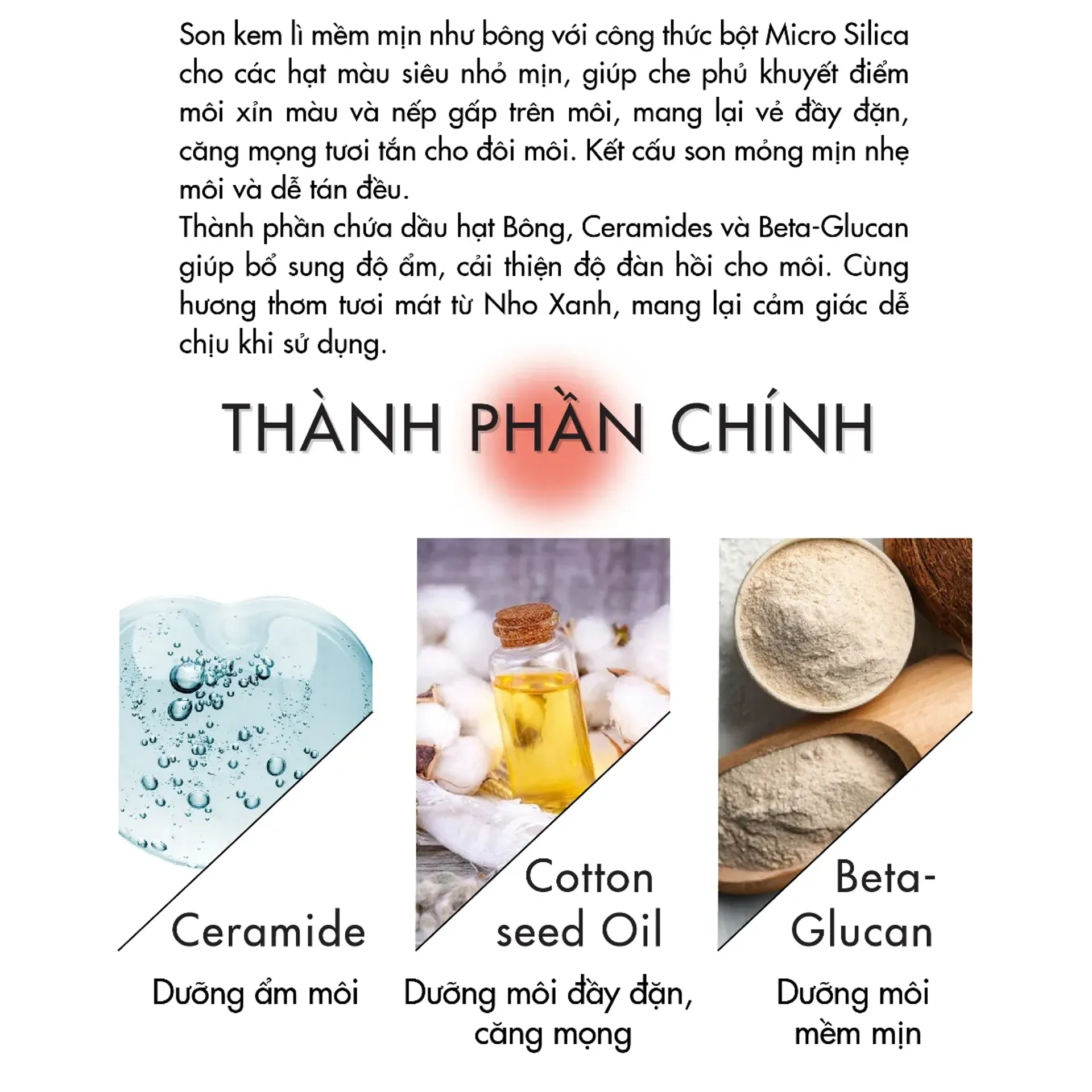 - Kết cấu lì mịn như cotton nhờ công nghệ Microbead từ Micro Silica, cho lớp màu bám chắc nhưng vẫn nhẹ môi.