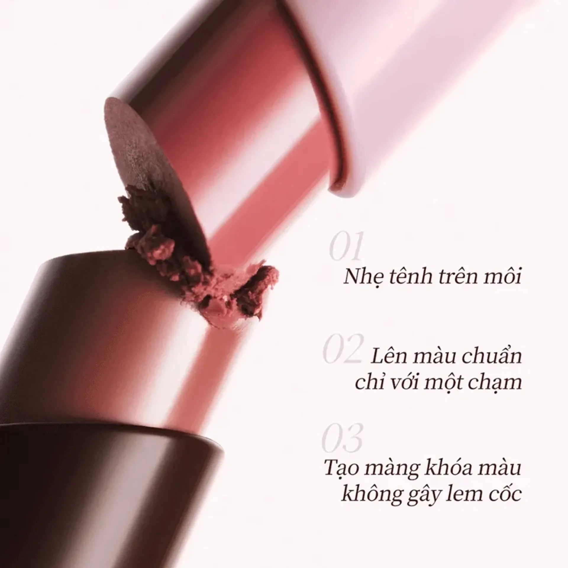 - Hiệu ứng lì mịn tự nhiên: Kết cấu soft-focus giúp bề mặt môi mịn mượt, không bột, không khô căng.