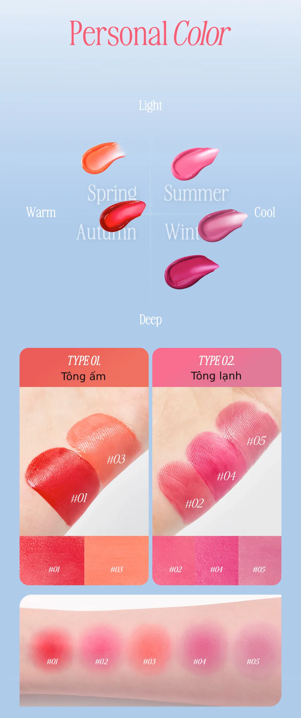 - Loại son tint giàu độ ẩm: từ các thành phần dưỡng ẩm sẽ tạo mềm mại và đủ ẩm cho môi cả ngày, hạn chế tình trạng khô môi