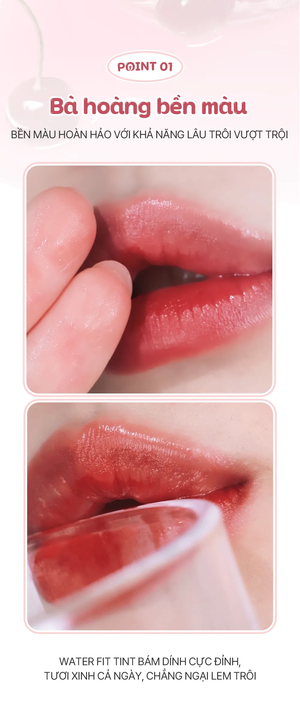 - Lớp tint mượt như nước giúp môi luôn mềm mịn, không bết dính hay nặng môi.