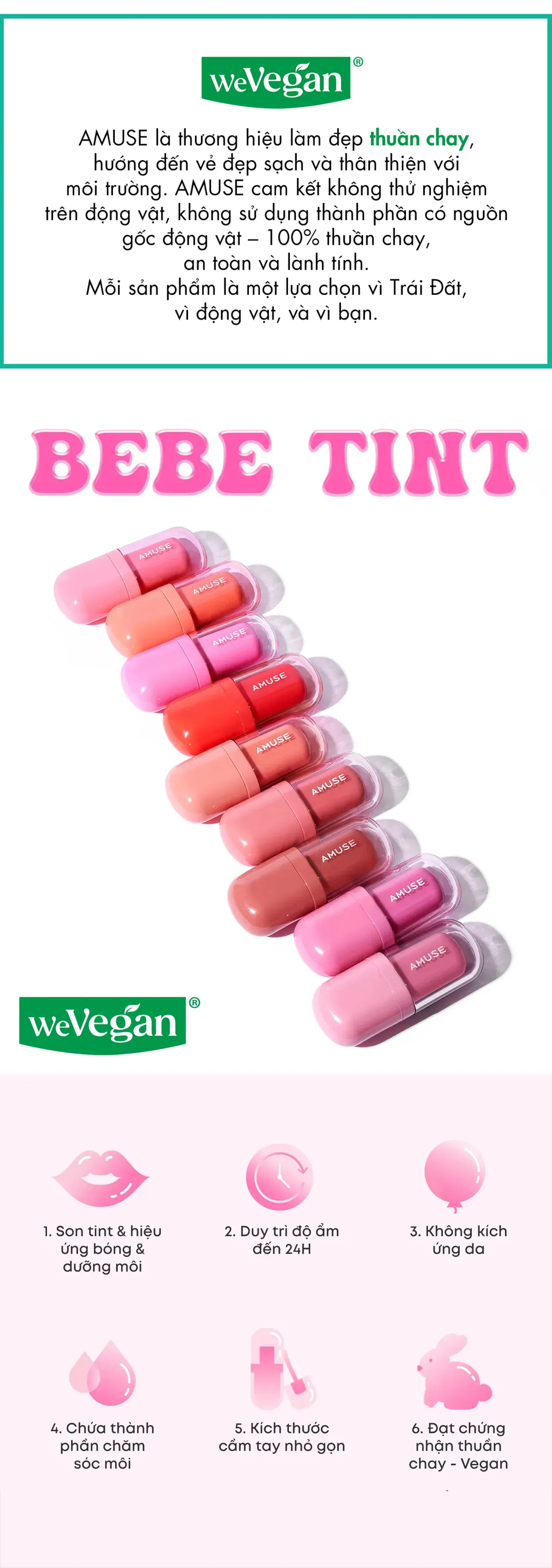 Son tint thuần chay Amuse Bebe Tint là sự kết hợp giữa son TINT + PLUMP + CARE trong một sản phẩm mang đến hiệu ứng môi căng mọng ngay lập tức mà còn chăm sóc môi một cách nhẹ nhàng, giúp bạn có đôi môi mềm mịn, đầy đặn.
