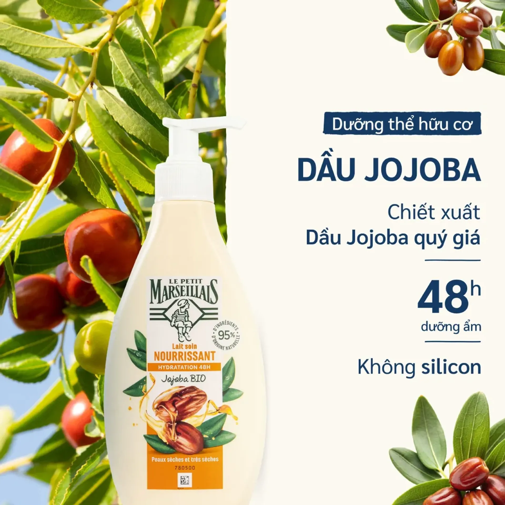 Le Petit Marseillais 95% Organic Body Lotion Jojoba Oil là sữa dưỡng thể hữu cơ giúp cấp ẩm tức thì và duy trì làn da mềm mại suốt cả ngày. Với 95% thành phần có nguồn gốc tự nhiên, sản phẩm dịu nhẹ, an toàn cho mọi loại da, kể cả da nhạy cảm. Dầu jojoba hữu cơ nổi bật trong công thức giúp cân bằng độ ẩm, nuôi dưỡng và mang lại làn da mịn màng, rạng rỡ.