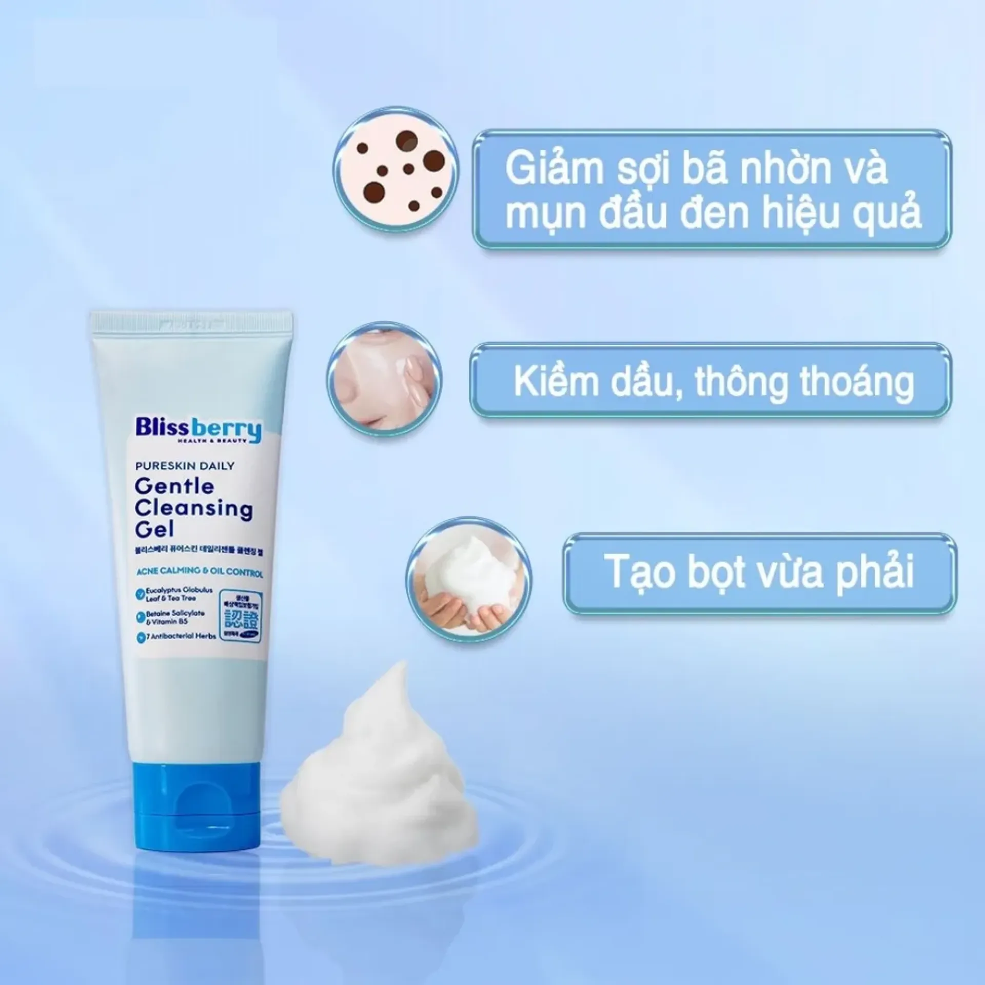 Công dụng: Blissberry Daily Gentle Cleansing Gel làm sạch da mặt dịu nhẹ nhưng hiệu quả, được thiết kế dành riêng cho làn da nhạy cảm và dễ kích ứng. Với kết cấu gel trong suốt, mềm mại, sản phẩm giúp làm sạch sâu bụi bẩn, bã nhờn và cặn trang điểm mà không làm mất đi độ ẩm tự nhiên của da, mang lại làn da sạch thoáng, ẩm mịn sau mỗi lần sử dụng