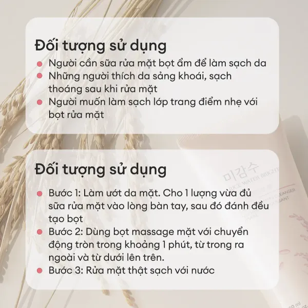 Lấy sữa rửa mặt ra tay và tạo bọt kỹ. Dùng bọt mát xa đều khắp bề mặt da trong khoảng 30 giây đến 1 phút. Rửa mặt sạch với nước.