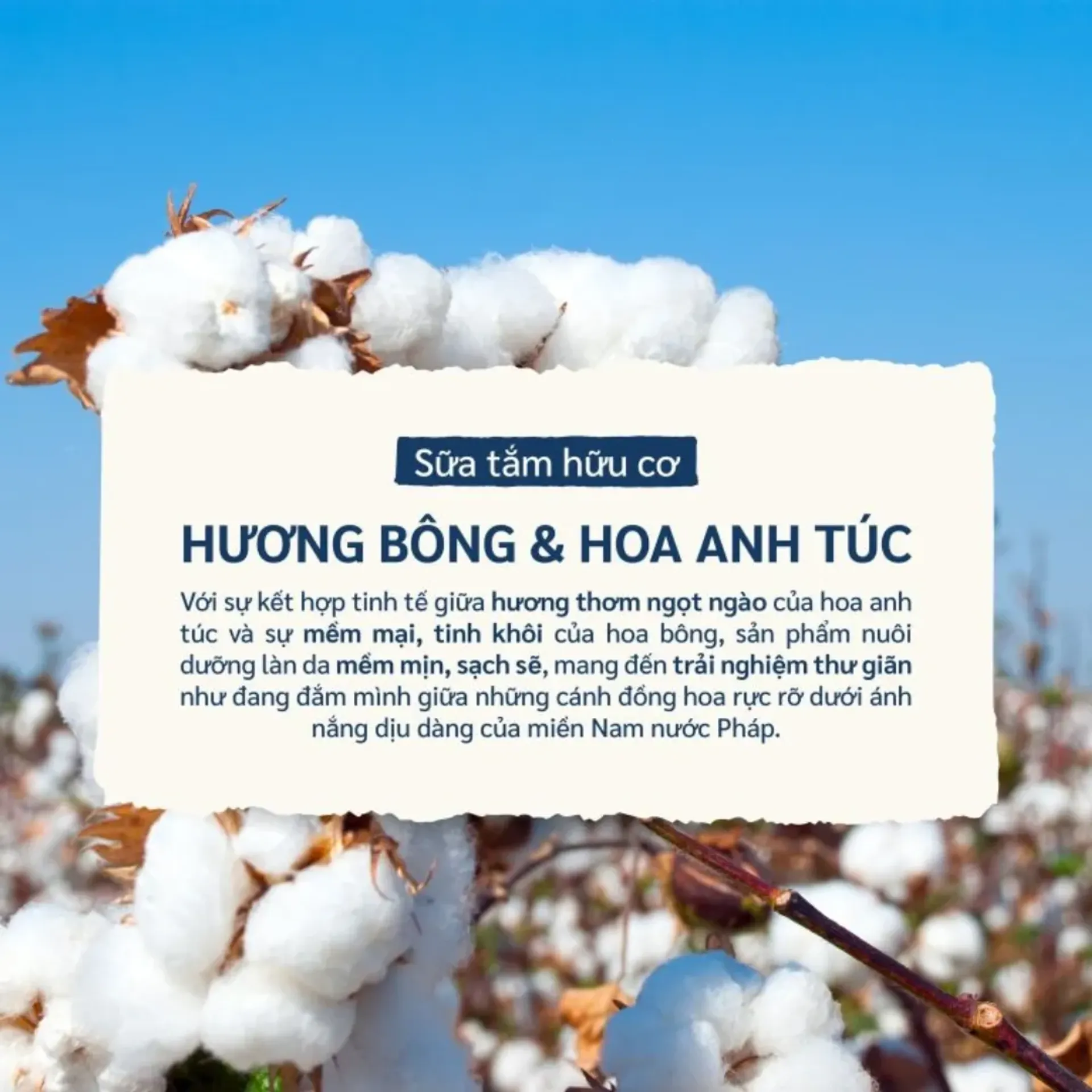 Sữa Tắm Dịu Nhẹ Hương bông và hoa anh túc hữu cơ Pháp không chỉ làm sạch, nuôi dưỡng làn da mịn màng mà còn mang đến hương thơm nhẹ nhàng, ngọt ngào và nữ tính.