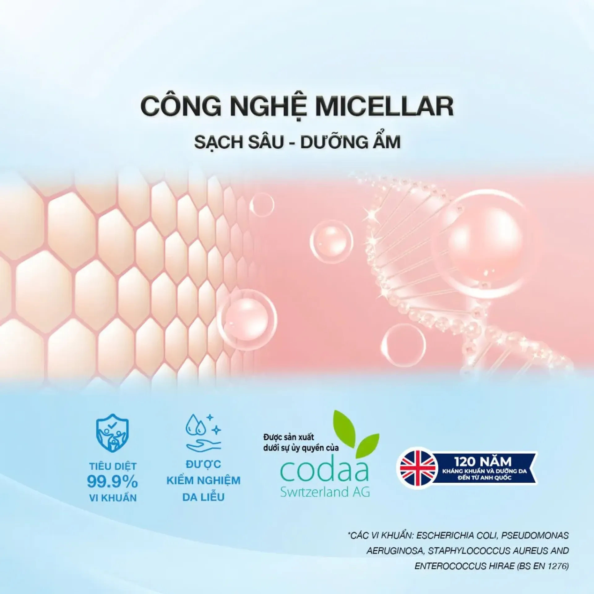 - Làm sạch sâu, sạch khuẩn vượt trội: Ứng dụng công nghệ Micellar giúp cuốn trôi bụi bẩn, bã nhờn và vi khuẩn trên da (hiệu quả kiểm nghiệm theo tiêu chuẩn EN1276:2019).