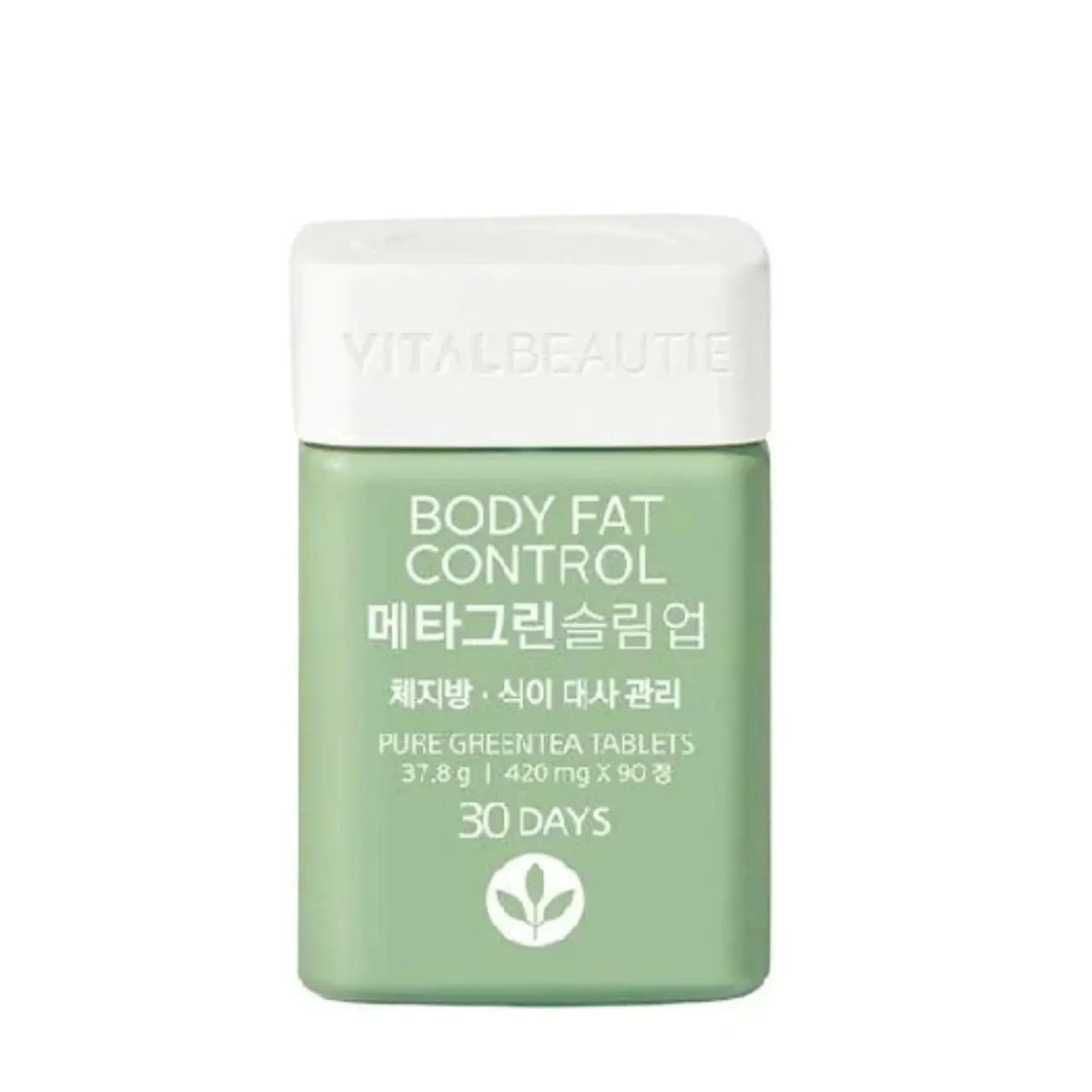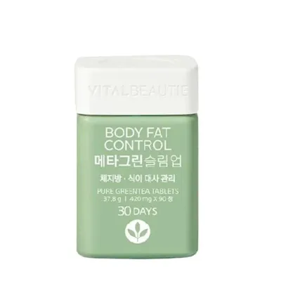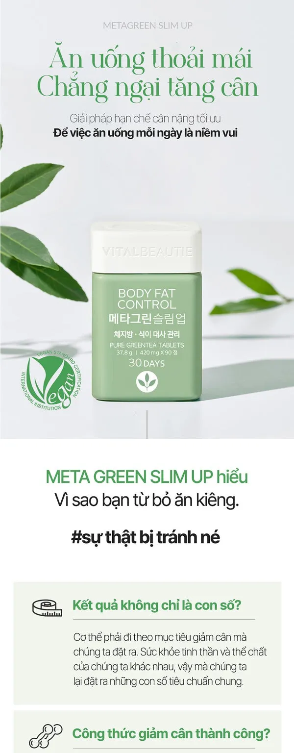Thực phẩm bảo vệ sức khỏe Vital Beautie Meta Green Slimup 90T chiết xuất từ bột trà xanh 473.1mg, vitamin C 30mg, bột dầu hạt bông 37.8mg, bột rau diếp xoăn 529.2mg. Có khả năng làm chậm sự oxy hóa, cơ thể thon gọn hơn, cơ thể thon gọn hơn bụng và giúp chị em nhanh chóng lấy lại vóc dáng thon gọn như ý muốn.