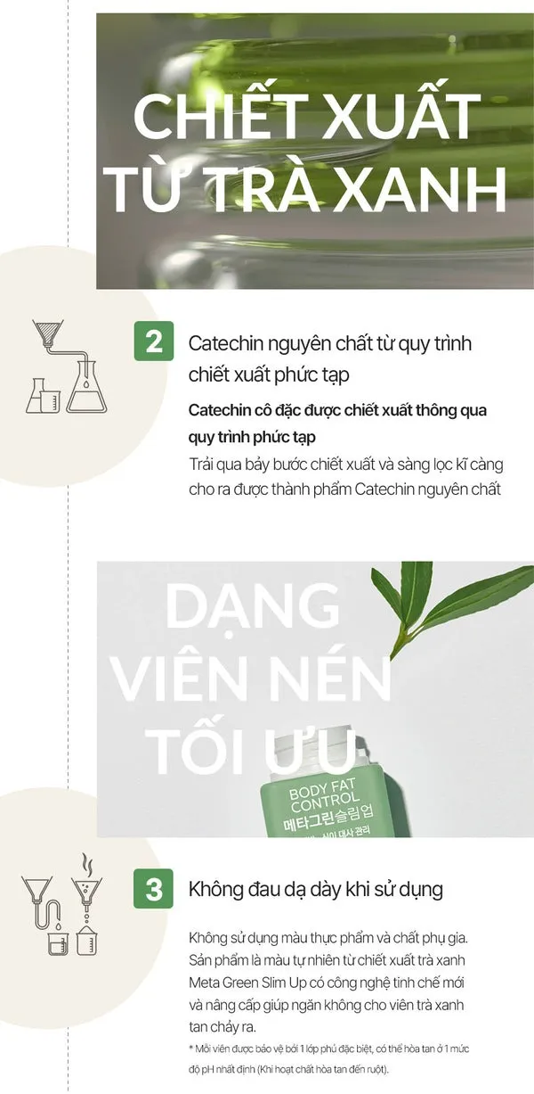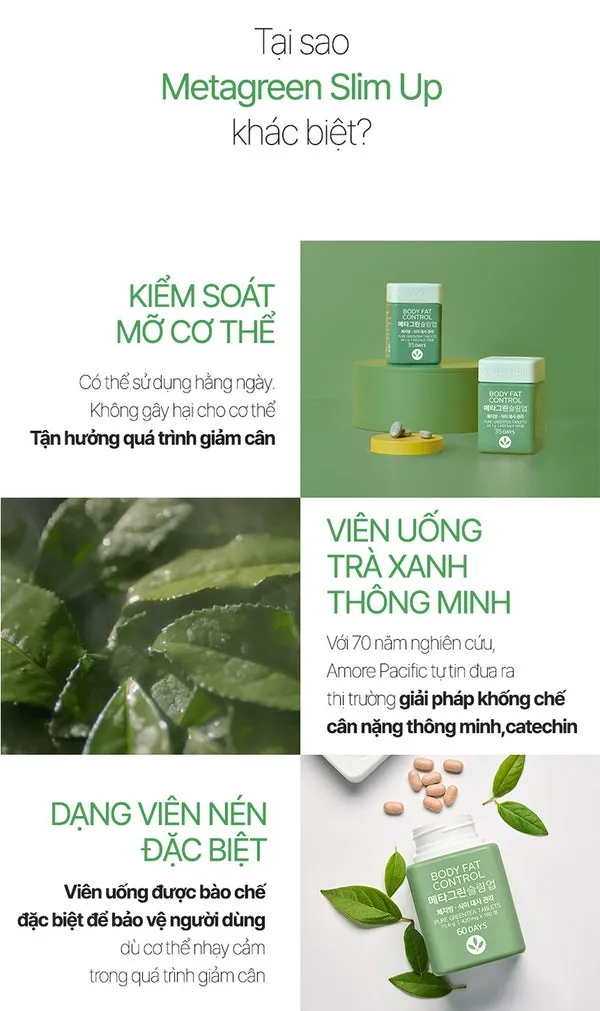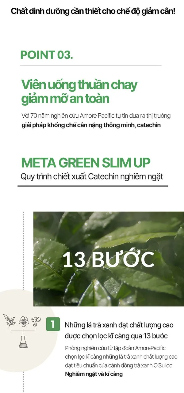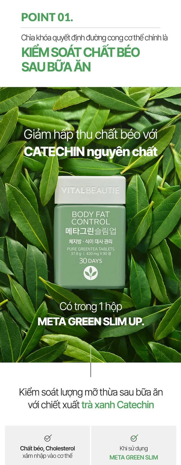Viên uống hỗ trợ cơ thể thon gọn hơn Vital Beautie Meta Green Slim bổ sung Catechin từ trà xanh - hoạt chất kiểm soát cholesterol, giảm hấp thu chất béo xấu và duy trì vóc dáng gọn nhẹ. Viên uống chiết xuất từ lá trà xanh nguyên chất, được trồng và thu hoạch tại cánh đồng O’Sulloc, Jeju, Hàn Quốc. Áp dụng công nghệ độc quyền của Amore Pacific, Meta Green Slim còn là sản phẩm hỗ trợ duy trì vóc dáng đầu tiên được cấp giấy chứng nhận thuần chay 100% an toàn, lành tính.
