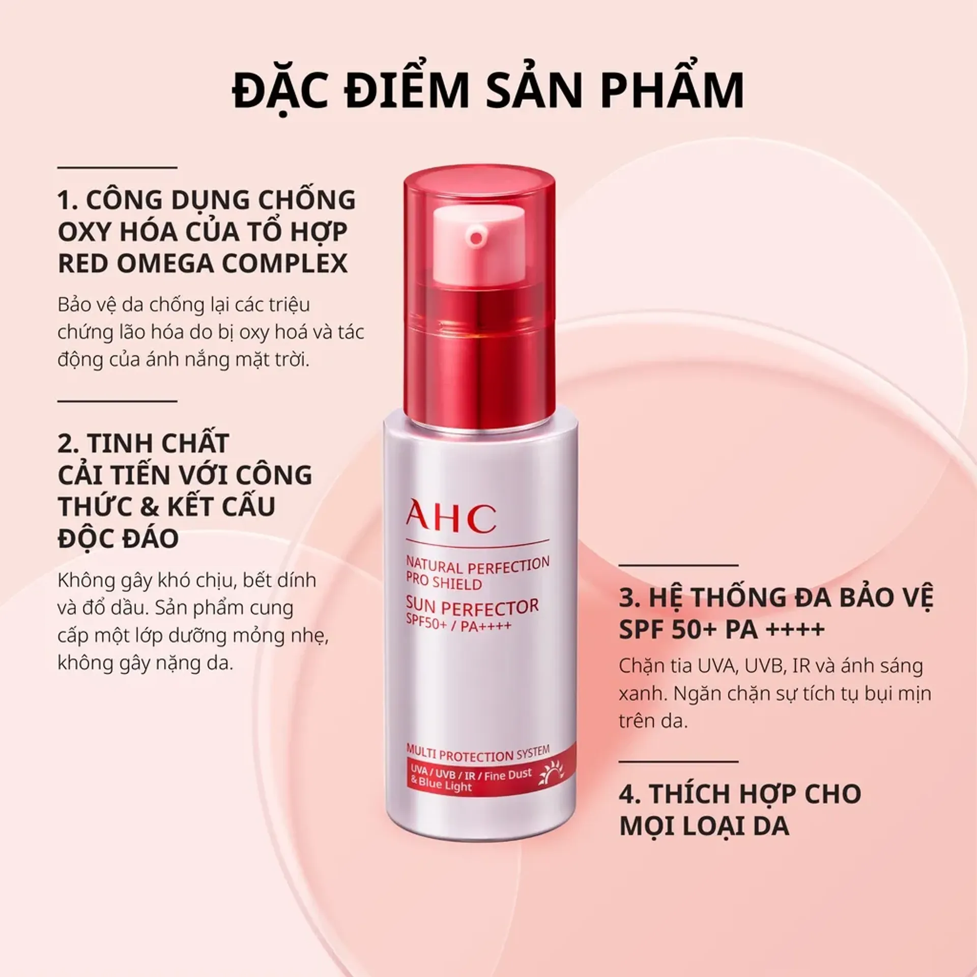 Nói về khả năng chống nắng, bảo vệ da hoàn hảo của sản phẩm AHC nhờ sở hữu chỉ số SPF50+, PA++++ vô cùng cao. Natural Perfection Pro Shield Sun Perfector hình thành màng chắn trên da, ngừa tác động từ tia UVA, UVB, tia hồng ngoại, tia cực tím lẫn ánh sáng xanh... Nhờ đó, tinh chất chống nắng góp phần ngừa tình trạng lão hóa sớm, ngừa tăng sắc tố dưới da gây đốm nâu, nám sạm, tàn nhang. Bên cạnh đó, chống nắng AHC dạng tinh chất nâng tông vừa phải, vừa có tác dụng làm sáng da và bảo vệ độ đàn hồi da nhờ các công thức độc quyền từ chiết xuất rau má, keo ong, panthenol...