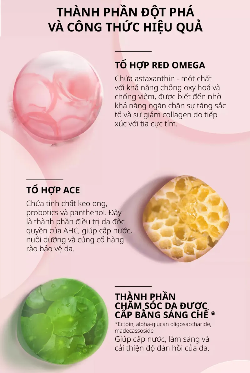 - Tổ hợp ACE: Công thức độc quyền của AHC bao gồm tinh chất keo ong, probiotics & panthenol đem lại hiệu quả dưỡng ẩm, giảm viêm sưng, củng cố hàng rào bảo vệ da khỏe khoắn.